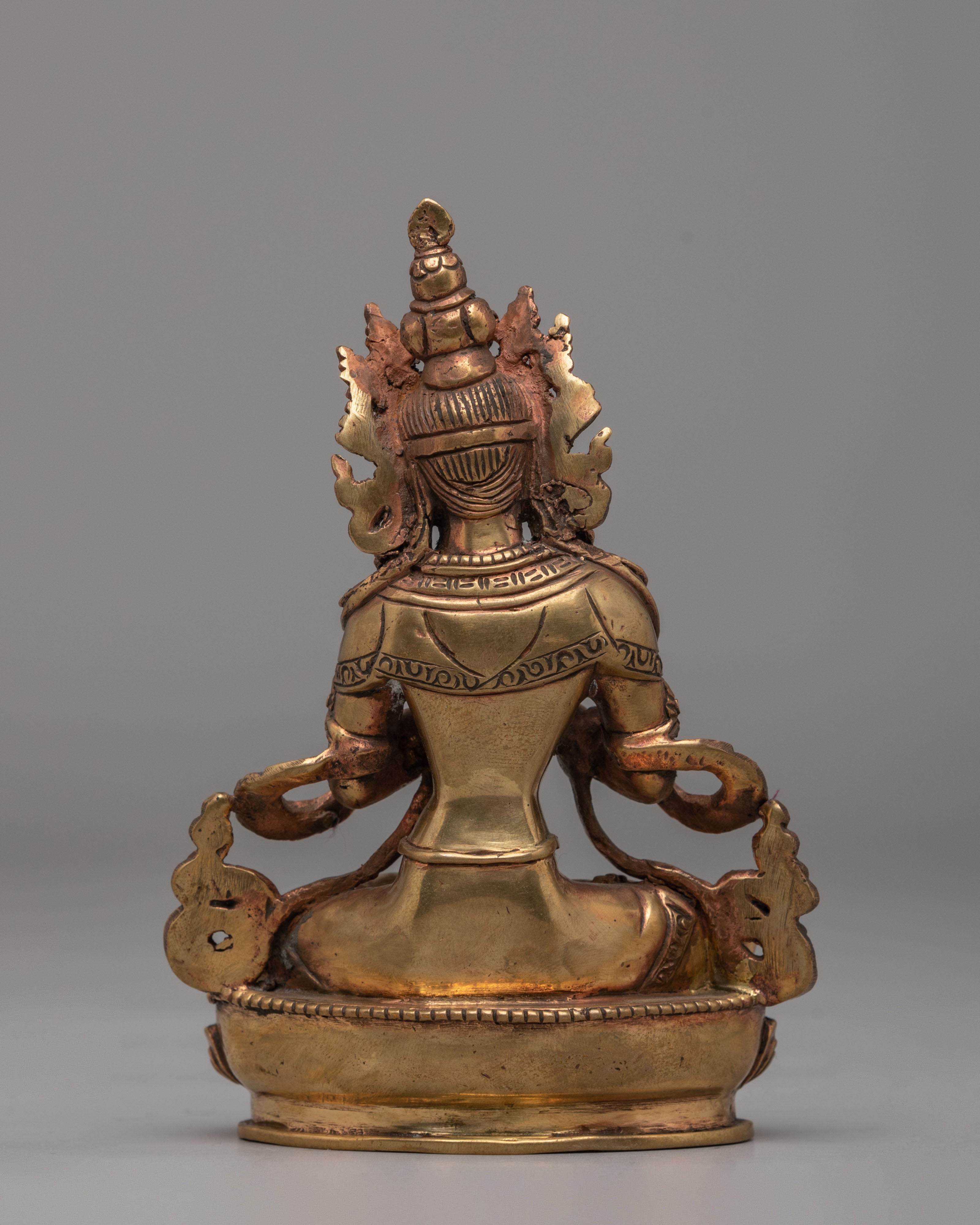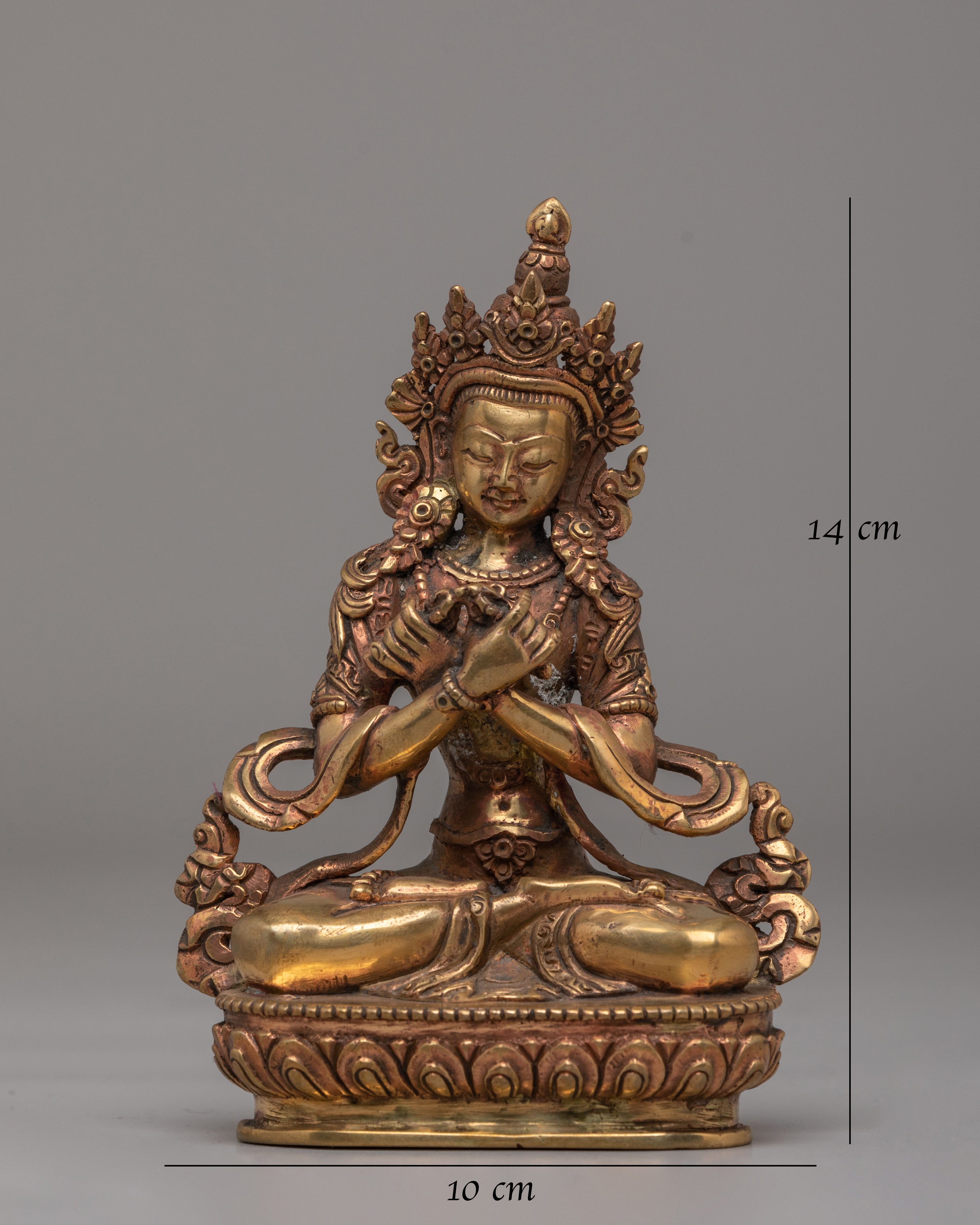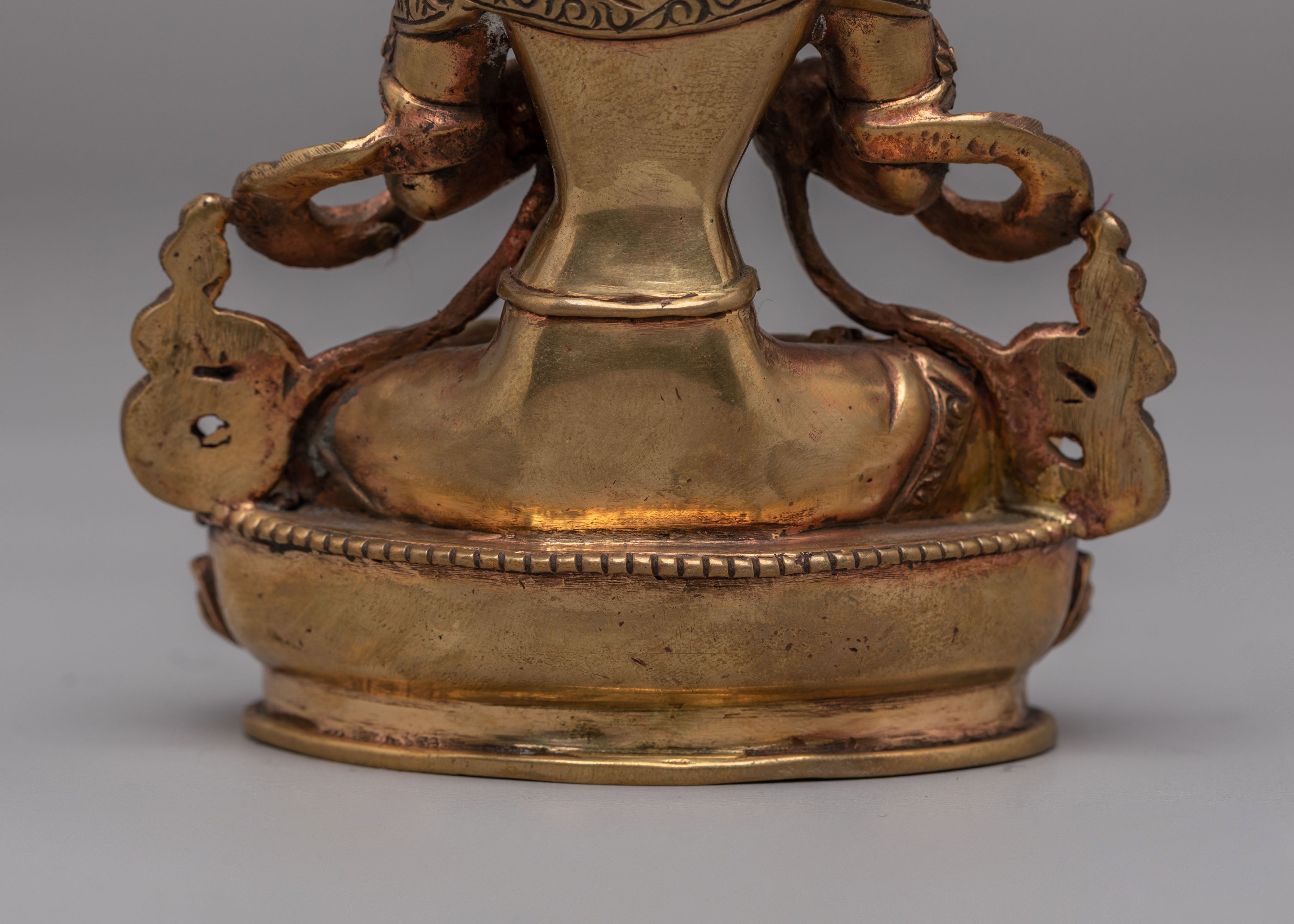 The copper body of the statue is beautifully designed, with intricate detailing on Vajradhara’s attire and the vajra he holds. His calm expression and majestic pose embody the unity of wisdom and compassion. Vajradhara represents the foundation of tantric teachings and the ultimate realization of the nature of reality. This statue serves as a visual representation of the Buddha’s teachings, offering a powerful reminder of the importance of wisdom, strength, and spiritual growth.