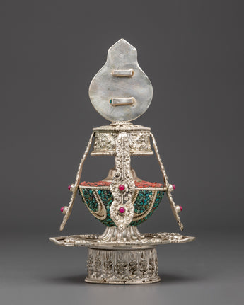 This Handcrafted Tibetan Vase is a captivating blend of artistic craftsmanship and deep spiritual meaning. Made from copper and embellished with authentic turquoise, ruby, and coral stones, this 22 cm tall vase symbolizes the nurturing of life force and the safeguarding of positive energies. Traditionally used in Tibetan rituals and meditation, it serves as a powerful tool to enhance spiritual harmony and vitality. Beyond its sacred purpose, this vase also makes a striking decor piece, infusing any room with beauty and balanced energy. Embrace the Tibetan Vase to enrich your spiritual practice and elevate your living space with its elegance and profound symbolism.