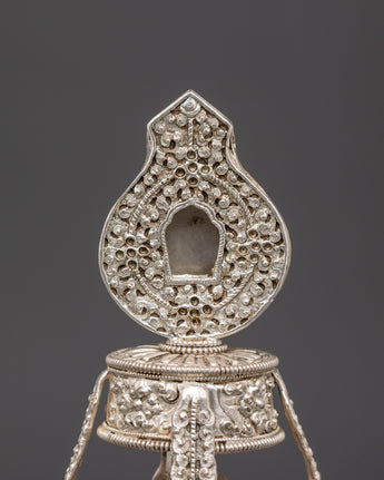 The Buddhist Ritual Long Life Vase, also known as the Tibetan Ayur Kalasha, is a sacred vessel symbolizing longevity, health, and prosperity. Used in Tibetan Buddhist rituals, it is believed to invoke the blessings of longevity deities like Amitayus and White Tara, who are revered for their power to protect and extend life. The vase is traditionally filled with sacred substances, such as herbs, grains, and mantras, channeling divine energy to promote well-being and vitality. It is a powerful tool in ceremonies to overcome obstacles and invite auspicious blessings. Whether placed on an altar or in meditation, the Long Life Vase represents a connection to spiritual vitality, offering protection and guiding one toward a balanced and harmonious life.