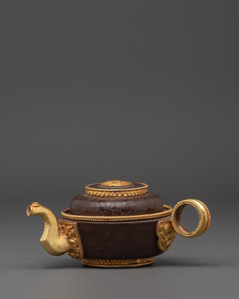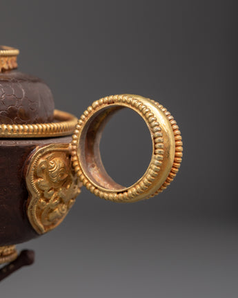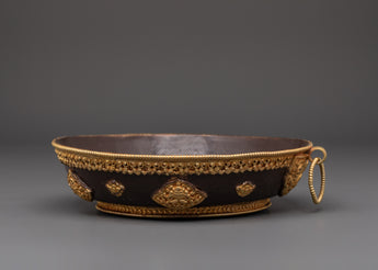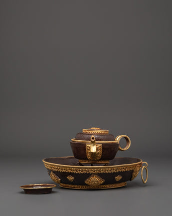 This set includes a beautifully shaped offering pot (10cm H x 14cm base, pot height 7cm, weight 0.34kg), a large plate (5.5cm H x 20.5cm base, 0.46kg), a small plate (1.3cm H x 7.5cm base, 0.026kg), and a decorative stand (6.5cm H x 5.5cm base, 0.086kg). Crafted from copper with oxidized detailing and adorned with 24K gold gilding, the set showcases traditional Tibetan artistry in both form and function. The total combined weight is 1.09kg, giving it a substantial and ceremonial presence.