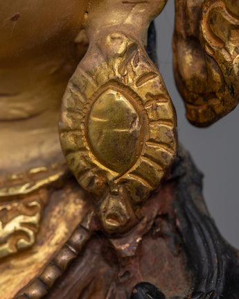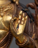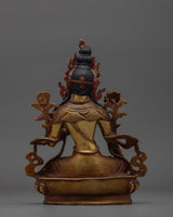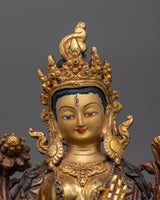 The White Tara Spiritual Healing Icon embodies peace, knowledge, and unlimited compassion. Handcrafted from oxidized copper with a bright 24K gold gilding, this statue is enhanced with detailed gold and acrylic paints that capture the goddess' divine essence. Her serene look and elegant stance promote inner tranquility and spiritual development, making her a revered figure in Buddhist meditation.