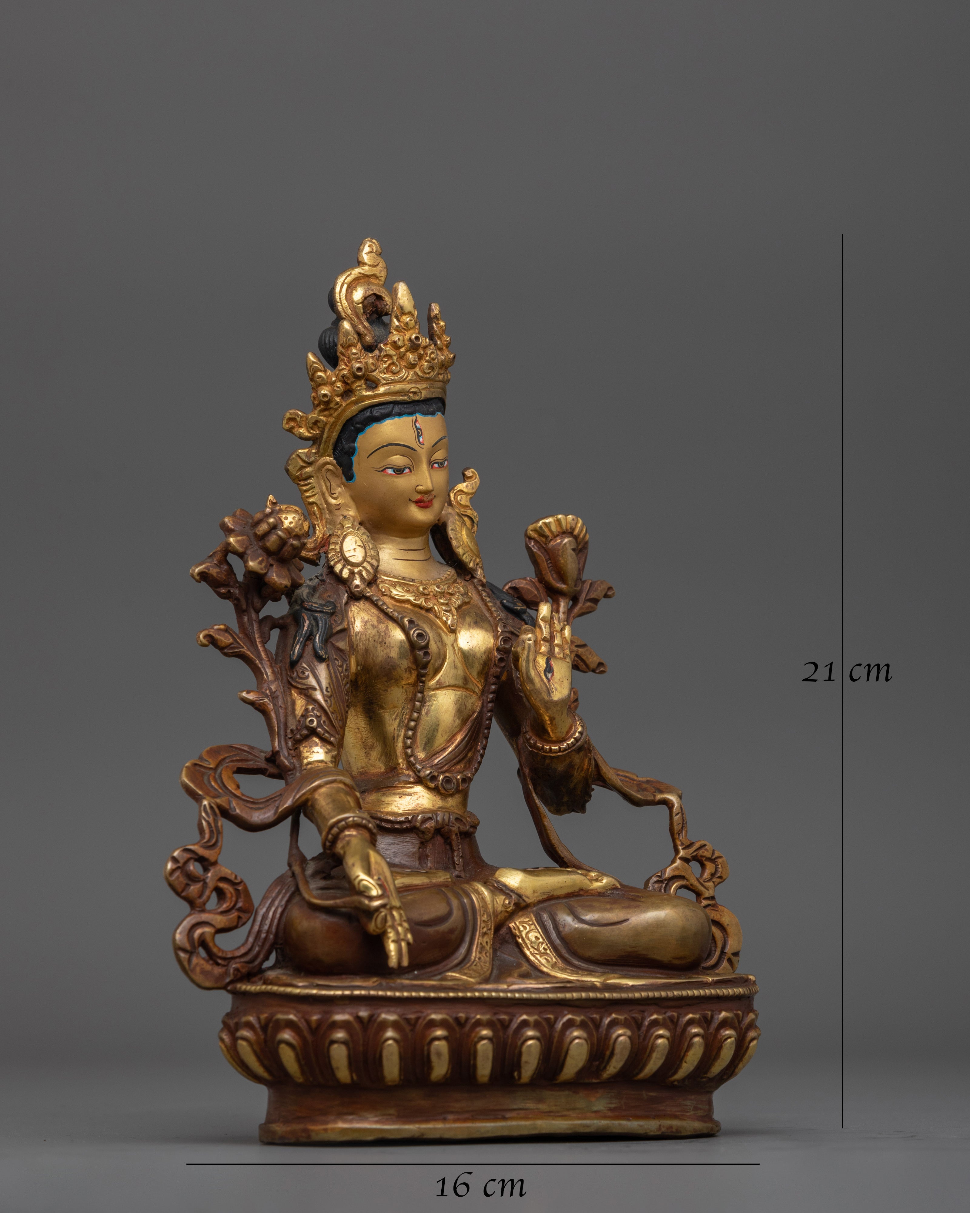 White Tara is depicted with seven eyes, which represent her caring alertness, and make her apart. Aside from the two usual eyes, she has a third eye on her forehead, one on each hand, and one on the soles of her feet. Her graceful appearance and design make this statue a powerful symbol of healing, compassion, and protection, inviting longevity and good health to those who revere her.