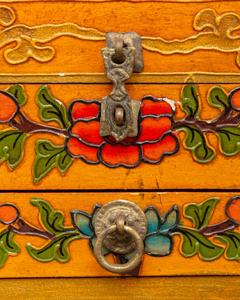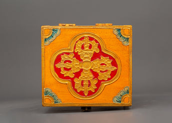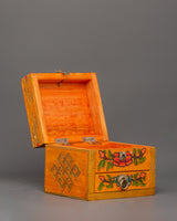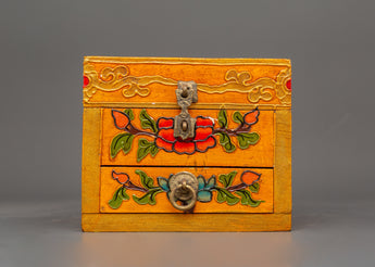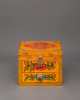 Add a vibrant touch of Himalayan history to your sacred space with this Hand-Painted Tibetan Wooden Box, which features two drawers and intricate artwork. This practical chest measures 14cm wide by 12cm high and weighs 0.61kg, making it ideal for storing jewelry, prayer beads, incense, or small ritual objects. The box is adorned in rich golden tones with red and green colors showcasing blooming flower motifs on the front and a powerful vajra symbol on top, representing spiritual strength and transformation.
