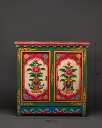 With this Tibetan Wooden Coffinet, a gorgeous hand-painted wooden chest influenced by traditional Tibetan artwork, you may explore the beauty and legacy of Himalayan craftsmanship. This item, which is 71 cm tall, 71.5 cm wide, and weighs 12.81 kg, is more than just furniture; it's a declaration of spiritual significance and cultural diversity. This coffinet is made from wood and painted with vivid acrylic colors. Its elaborate designs and motifs are a reflection of Tibetan artistic and spiritual traditions.