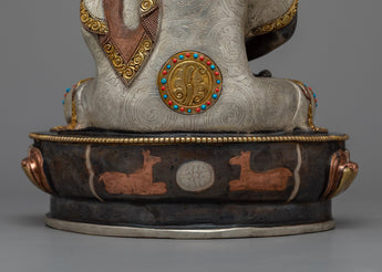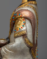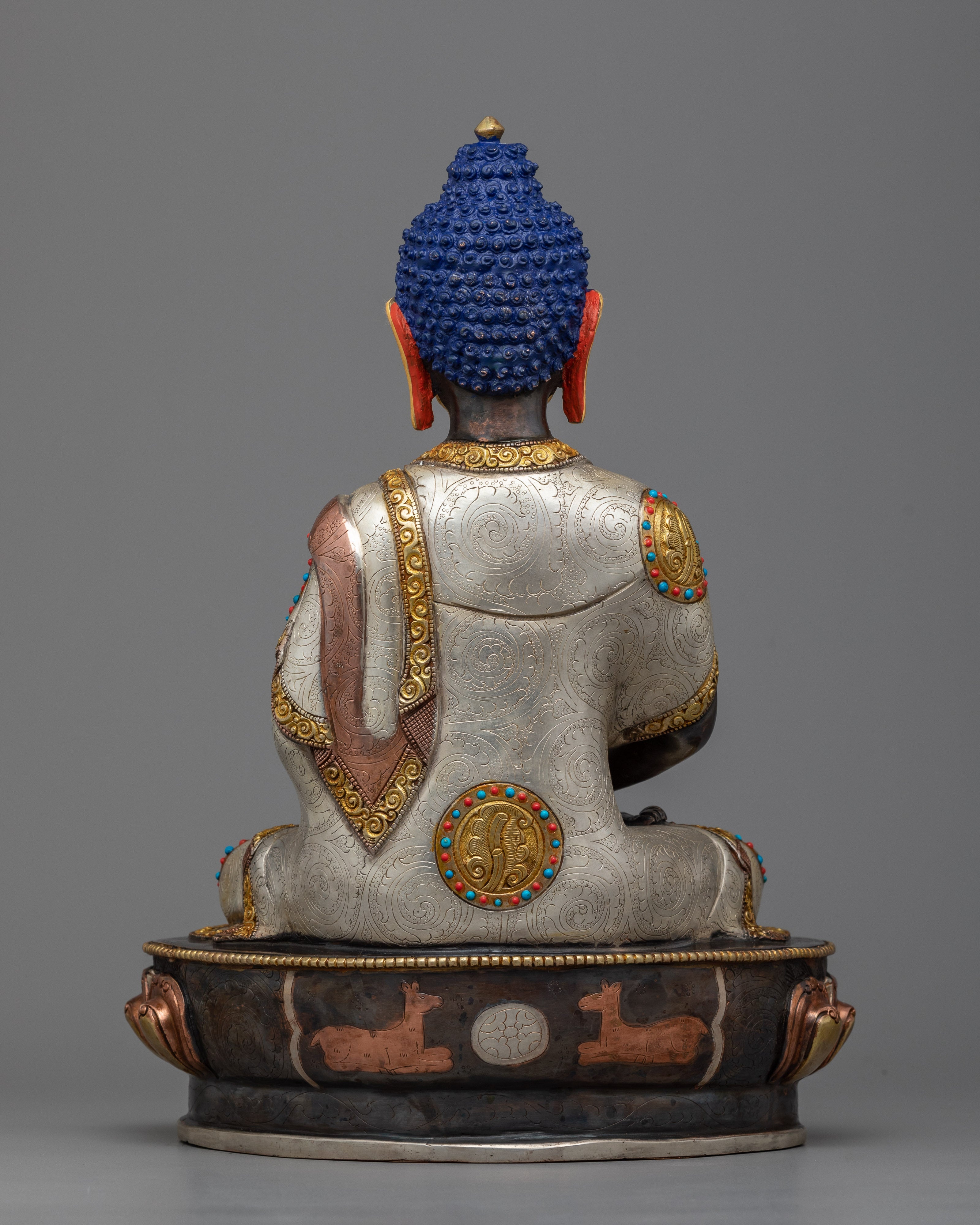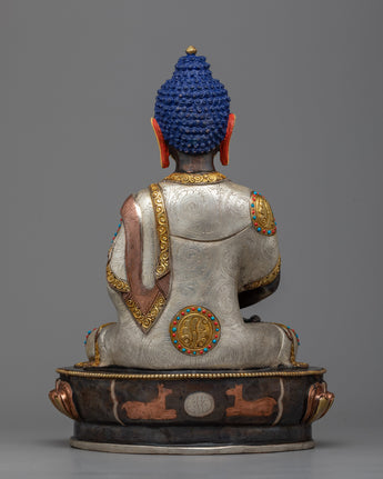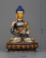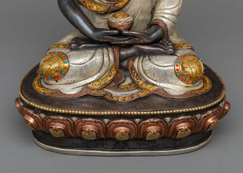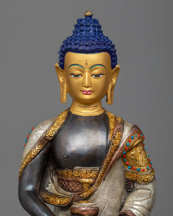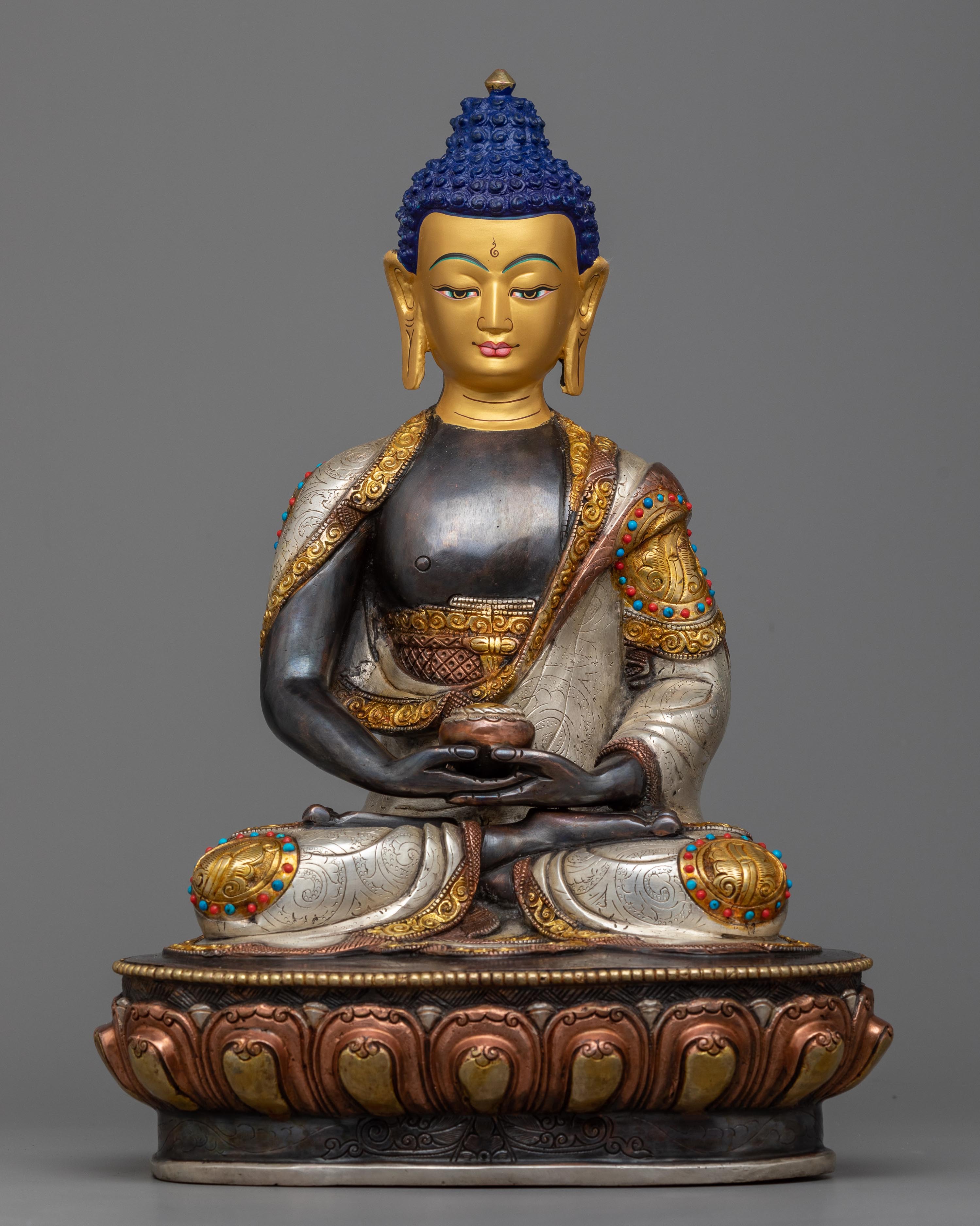 Our 12.9" Amitabha Buddha Figure, skillfully handcrafted by talented Nepalese artisans, will improve your spiritual environment. A copper body with 24K gold gilding, silver plating, and acrylic paints that highlight the deity's expressive face characteristics make up this stunning sculpture. Our artists use the time-tested lost wax casting technique, producing work of unrivaled quality and exquisite detail. This Buddha statue is a wonderful option for home décor, altarpieces, or as a special present that promotes spiritual growth and cultural awareness. Its dimensions are 33 cm in height and 24 cm at the base.