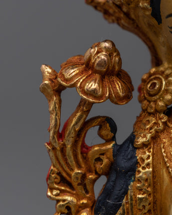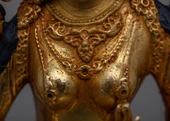 Our copper Tiny Green Tara statue, a representation of enlightened action and caring care, might be the ideal enhancement to your tranquil retreat. This 3.7" x 2.7" statue, despite its diminutive size, exemplifies the Buddhist principles of compassion, mercy, and prompt action. Work of art that was painstakingly machine-molded from top-quality copper. We are proud of the minute details, the vivid acrylic paintings, and the expert 24-karat gold gilding. This green deity's glossy texture symbolizes Tara's immortality and the enduring influence of her teachings.