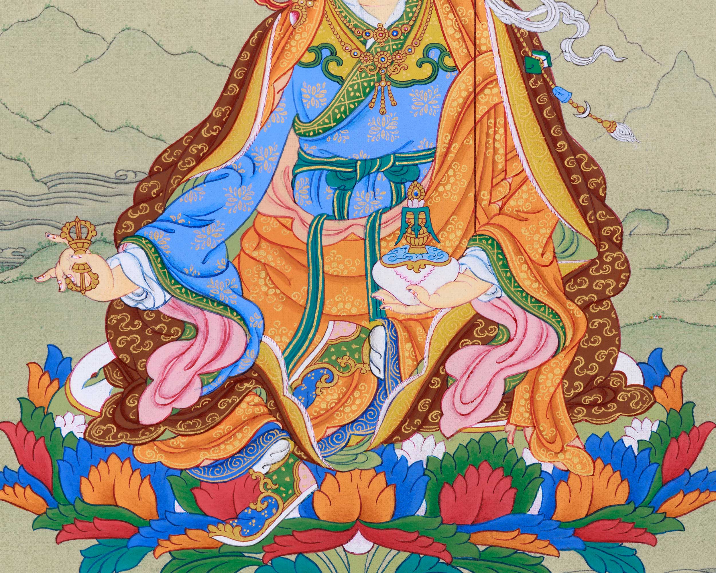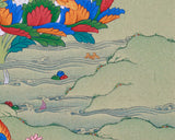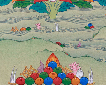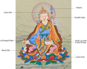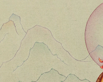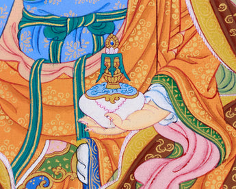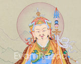 The Traditional Art of Guru Padmasambhava Thangka, meticulously hand-painted on a cotton canvas with natural stone colors and adorned with genuine 24K gold, represents an exquisite portrayal of spiritual reverence and devotion. Guru Padmasambhava, also known as the "Lotus-Born," holds a revered place in Tibetan Buddhism as the founder of the Nyingma tradition and a master of transformation. His image, captured in intricate detail on the canvas, emanates an aura of wisdom, compassion, and divine presence. Each brushstroke reflects the mastery of the artist, conveying the essence of Guru Padmasambhava's enlightened qualities and teachings. Adorned with delicate touches of 24K gold, the Thangka exudes an aura of sacredness and divine blessings, symbolizing the luminosity of Guru Padmasambhava's enlightened state. Whether used as a focal point for meditation or as a cherished decorative piece, the Traditional Art of Guru Padmasambhava Thangka serves as a powerful reminder of the profound teachings and transformative power of this revered master.