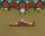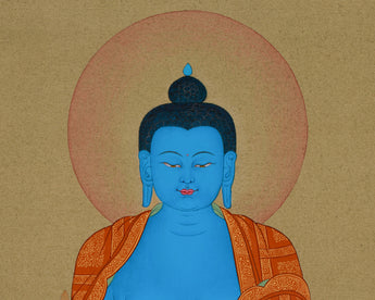 While his right hand, in the Varada Mudra, holds a stem of the healing plant, bestowing blessings of health and well-being, his left-hand cradles a monk's bowl filled with myrobalan fruit, which is known for its powerful medicinal properties. His radiant, bright halo symbolizes wisdom that guides followers toward serenity and enlightenment. Every brushstroke reflects commitment, making this thangka an excellent meditation aid for invoking healing energy, inner calm, and protection. Whether used as spiritual decor, for personal meditation, or as a meaningful Buddhist gift, this thangka serves as a profound reminder of compassion and global well-being.