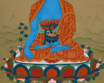 This Traditional Bhaisajyaguru Thangka is a sacred image of the Medicine Buddha, revered in Buddhism for his divine healing abilities. His rich lapis lazuli blue body symbolizes unending compassion and the ability to alleviate suffering on all levels: physical, mental, and spiritual. He radiates peace and security while seated on a lotus base in a meditative posture. This thangka features intricate designs, vibrant acrylic colors, and genuine 24K gold accents. Created in the traditional Karma Gadri style, it captures the rich spiritual heritage of Tibetan Buddhism, ensuring that each stroke is clear and precise.