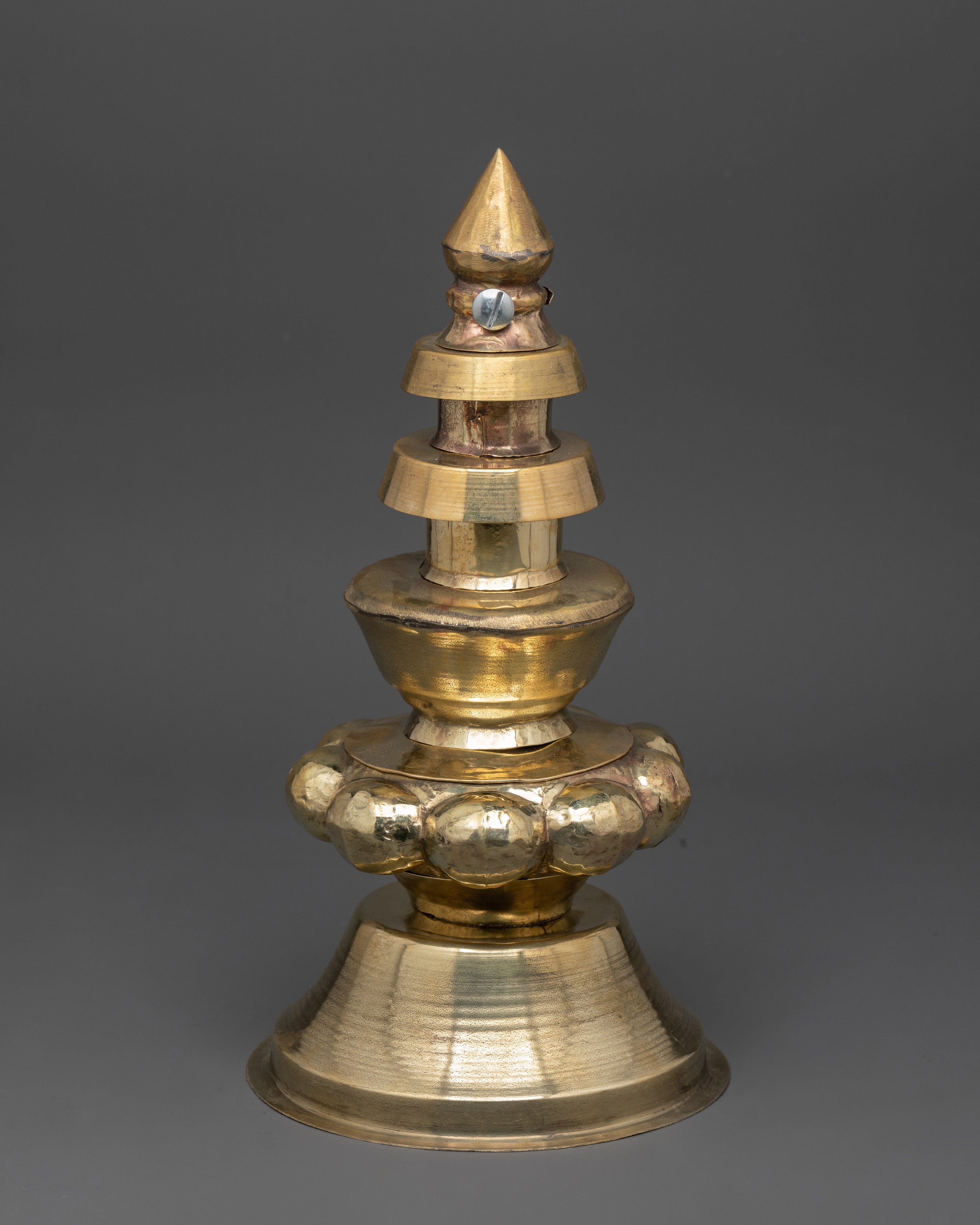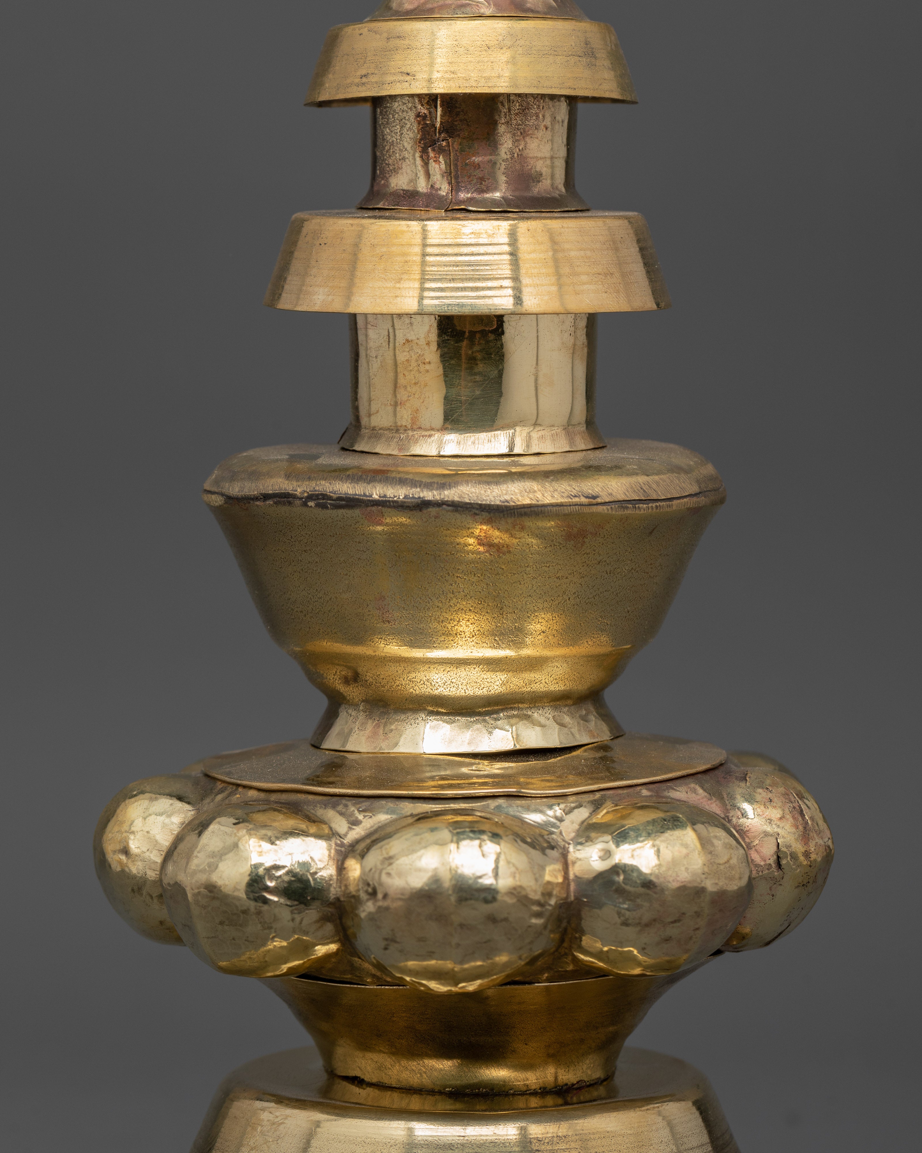 This artwork, expertly crafted from brass, captures the timeless elegance and profound cultural significance of Himalayan temples. It is lightweight, weighing only 0.42 kg, and can be placed atop a shrine to enhance the spiritual ambiance and invite heavenly benefits into your surroundings.