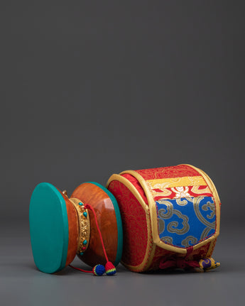 A Chod drum, integral to the Chod spiritual practice in Tibetan Buddhism, is a unique and symbolic instrument. Also known as a damaru, this small, double-sided hand drum features a narrow waist that connects two drumheads. The drum's shape is often likened to that of an hourglass, embodying the union of wisdom and compassion. Used by Chod practitioners during ritualistic ceremonies, the drum's rhythmic beating is believed to connect with the sacred energies, facilitating meditation and the realization of emptiness. The Chod drum, with its ritualistic role, underscores the synthesis of sound, spirituality, and meditation in Tibetan Buddhist traditions.