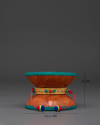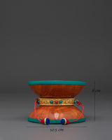 Discover the profound resonance of this Traditional Buddhist Damaru, crafted from genuine Bhutanese wood and intricately adorned with coral-like stones, copper, and gold plating. It weighs 0.23 kg with a 0.12 kg cover, making it ideal for monastic ceremonies or private meditation areas. A key ritual tool in Tibetan Buddhist ceremonies, meditation sessions, and tantric practices, this sacred double-sided drum represents the confluence of wisdom and compassion.