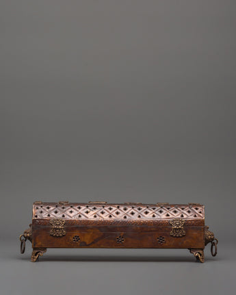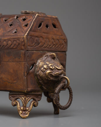 The incense burner has ornamental legs allowing appropriate air circulation, ensuring efficient and safe burning. The lid has a lattice design that allows for the smooth diffusion of incense smoke, providing a peaceful and serene environment. Whether used for everyday rituals, meditation, yoga practice, or as a centerpiece in a Buddhist shrine, this magnificent copper incense burner brings peace, serenity, and positive energy into your environment.