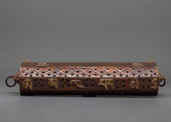 This handcrafted Traditional Buddhist Incense Burner, made of copper, is a stunning and practical addition to any spiritual altar or meditation area. This incense holder, which measures 11 cm in height and 36 cm in width and weighs 0.68 kg, is intended to safely burn incense sticks or resin while adding to the spiritual ambiance of your surroundings. The exquisite sacred mantra engravings and elaborate carvings represent traditional Himalayan workmanship and Buddhist symbolism, transforming it into a spiritual instrument and an aesthetic admiration.