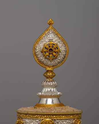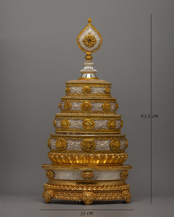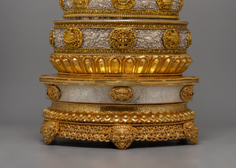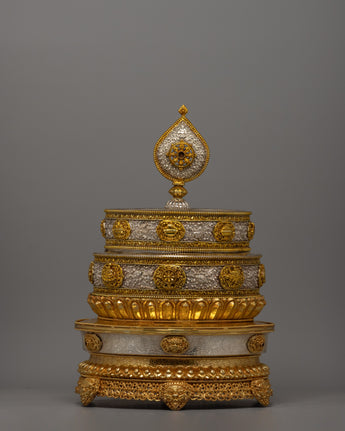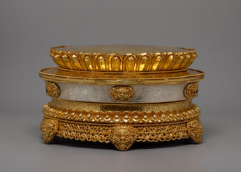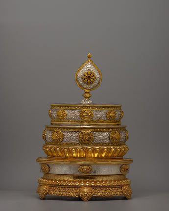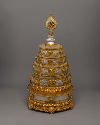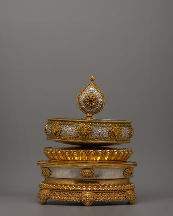 The Mandala Offering Set is an outstanding example of traditional workmanship intended to improve Buddhist offering rites. This item exudes elegance and veneration thanks to its copper body, gold plating, and pure silver details. It is 62.5 cm tall and 33 cm wide, making it substantial and visually dominant. The set, weighing 6.88 kg, combines durability with an elaborate design, making it ideal for ceremonial usage and a beautiful centerpiece in religious areas.
