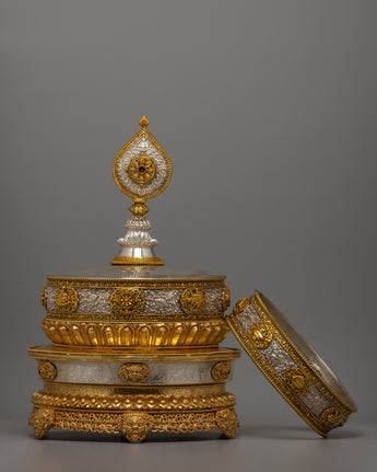 This Mandala Offering Set is more than a ceremonial item; it is a cultural and spiritual treasure demonstrating the passion of talented craftspeople. Handcrafted with precision and care, it is an excellent choice for individuals who love the confluence of spirituality and craftsmanship. Whether used for traditional monastic offerings or exhibited in a private meditation room, the set is a powerful sign of devotion, making it an excellent addition to any spiritual collection.