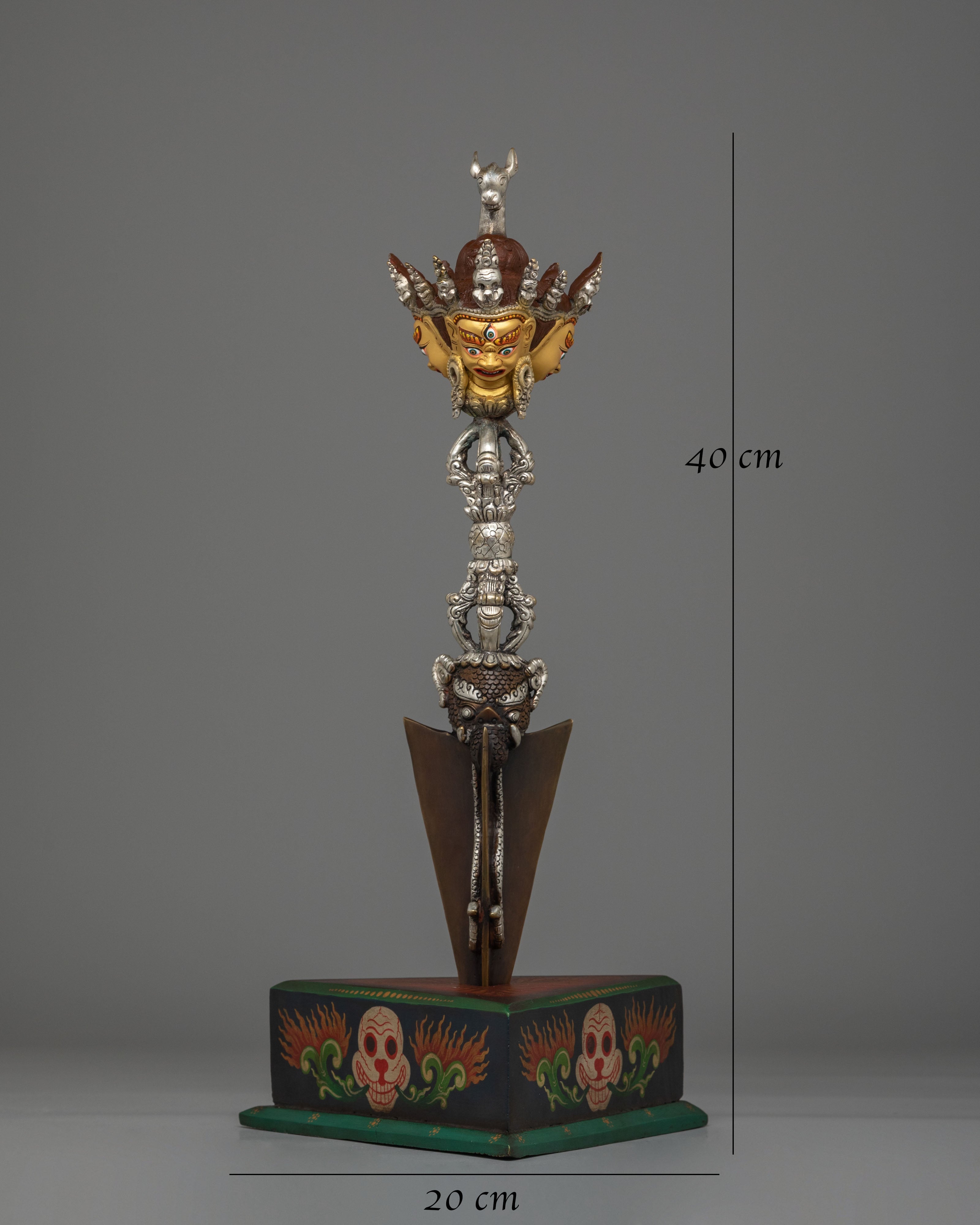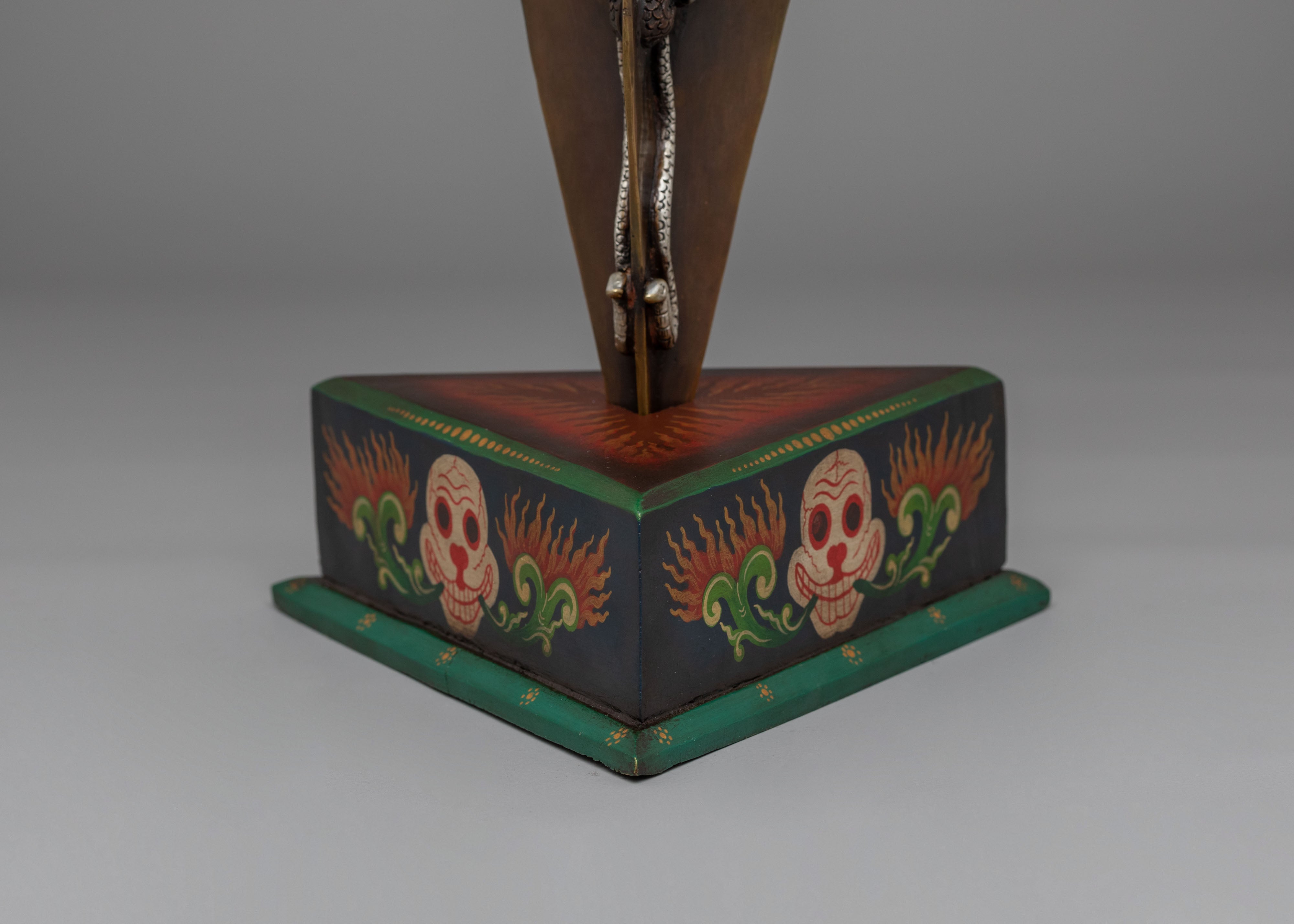 This Handmade Hayagriva Phurba with Vajra measures 40cm (Height) x 20cm (Length) x 20cm (Width) and weighs 1.72 kg. Crafted from iron and wood, accented with 24K gold plated elements and detailed acrylic color work, this Tibetan ritual dagger is designed for tantric practice, shrine display, and Buddhist altar decor. The phurba is mounted on a hand-painted wooden base, creating a commanding presence for meditation spaces and Himalayan art collections.