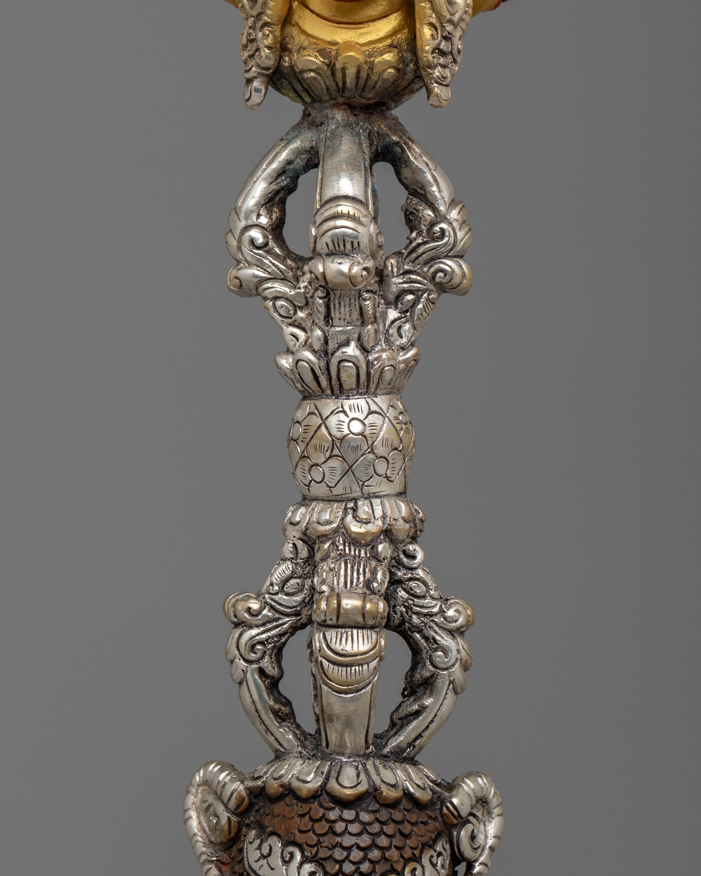 In Vajrayana practice, the Hayagriva Phurba with Vajra represents fierce compassion, protection, and the union of wisdom and method. This 24K gold plated Tibetan ritual dagger is ideal for tantric altar decor, Buddhist shrine display, and collectors of Himalayan ritual art. A powerful Hayagriva phurba statue, Vajra ritual dagger, and Buddhist protection symbol, it serves as a ceremonial altar centerpiece and meaningful spiritual gift for dedicated practitioners.