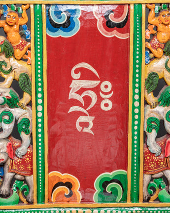 Every aspect of this Buddhist seat holds spiritual significance. The protective dragon pattern at the top denotes power and dharma protection, whilst the burning jewel represents wisdom and enlightenment. Elephants, flowers, and traditional patterns flank each other, representing auspiciousness, wealth, and the removal of impediments. The rich, red center, featuring Tibetan calligraphy, symbolizes blessings and adds an authentic cultural touch. This motif combination elevates the throne beyond its function as a stand, transforming it into a hallowed vehicle for devotion.