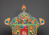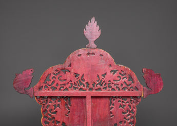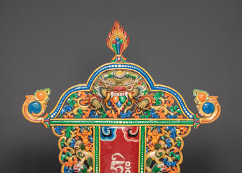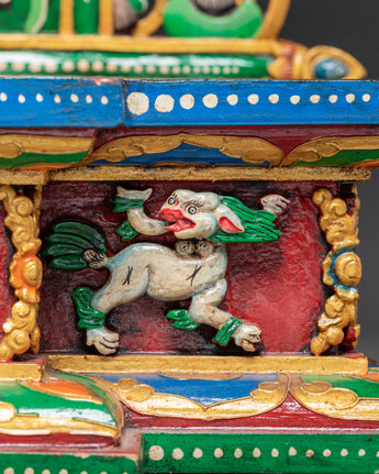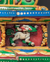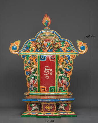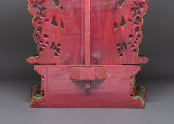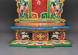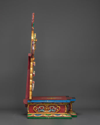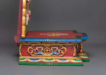 This hand-carved Buddhist throne is ideal for displaying sculptures of the Buddha, Tara, Guru Rinpoche, or other deities and serves as a powerful focal point in any holy space. The harmonious combination of brilliant colors and intricate carvings evokes the traditional Tibetan spirit, culminating in a spiritual and artistic masterpiece. This throne is not only an altar ornament, but also a piece of devotional art that will improve your practice and spiritual connection.