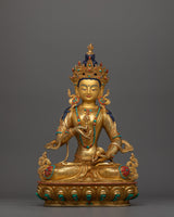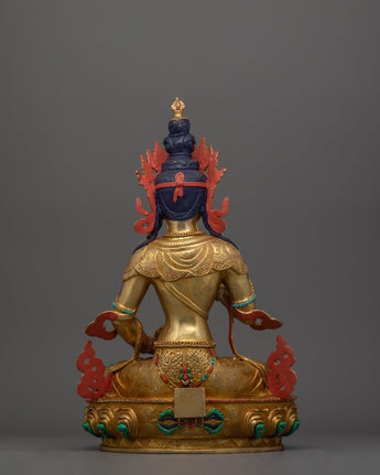 This Traditional Buddhist Vajrasattva Altar Statue is skillfully carved from real copper and gilded with 24K gold, which adds a bright sheen. The statue's diligent gold and acrylic paintings bring each detail to life, while hand-carved gemstones add beauty and spiritual meaning. This hefty artwork, measuring 16.3 inches (41.5 cm) in height, 12.0 inches (30.5 cm) in base, and weighing 5.65 kg, makes an eye-catching focal point for any altar or sacred area.