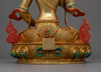 Vajrasattva, the embodiment of purification and enlightenment, is shown with a calm look that displays compassion and knowledge. He is depicted in a commanding attitude, exuding strength, and grace. A magnificent halo frames his figure, decorated with delicate floral designs painted in brilliant acrylic hues to represent the heavenly light of knowledge that he exudes. Vajrasattva's left-hand holds a bell, representing insight and healing through emptiness. His right-hand grasps an upright vajra, which represents strength and power. This statue is not only a stunning work of art but also a potent tool for spiritual practice, enabling practitioners to connect with Vajrasattva's cleansing force. His presence on your altar will inspire clarity, inner serenity, and the transformational power of compassion, making it an indispensable addition to any spiritual