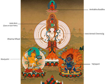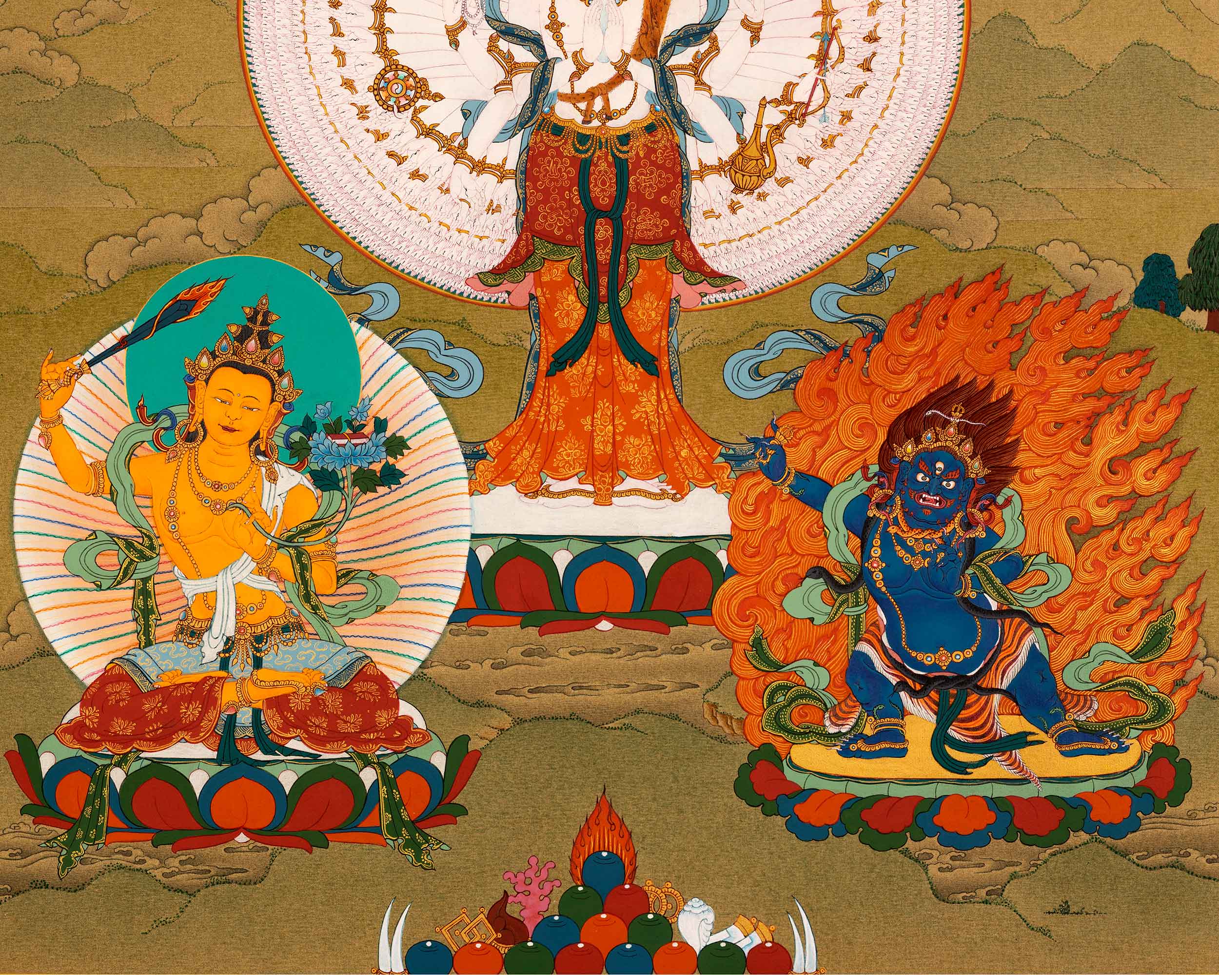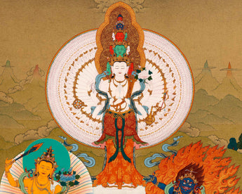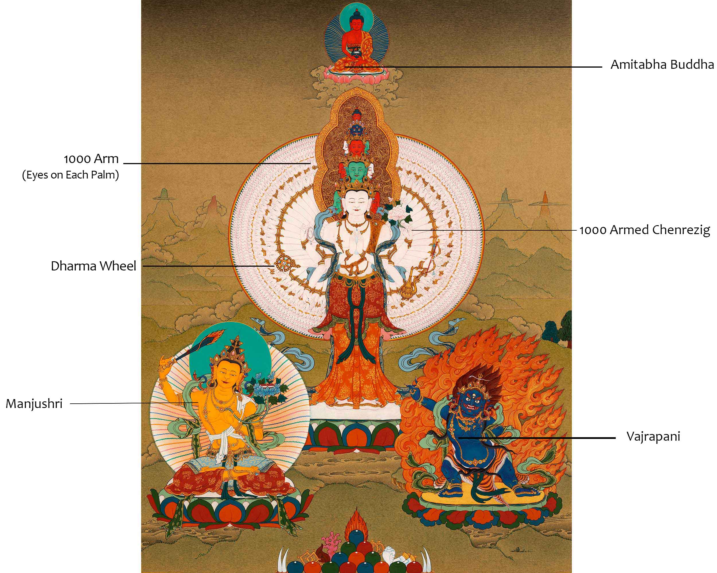 Traditional Chenrezig Avalokiteshvara Thangka | 1000 Armed Chenreizg with Manjushri and Vajrapani