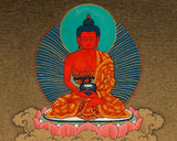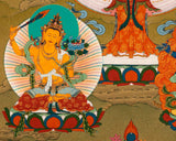 The Traditional Chenrezig Avalokiteshvara Thangka portrays 1000 armed Chenrezig, Manjushri, Vajrapani, and Amitabha. Avalokiteshvara wears stunning gems and patterned silk clothing. Chenrezig, placed in the middle, holds a lotus, a bow, an arrow, and an empowerment vase in his left hand. In his right hand, he holds a crystal rosary, a Dharmachakra, and a hand in the offering mudra. His first two hands are clasped together with a wish-fulfilling stone close to his heart. He has eleven distinct heads in all. Each face exhibits characteristics that are either peaceful, somewhat angry, or angry. The deep blue god Vajrapani has long, ferociously flowing hair. He has tiger skin covering his body and is angry.