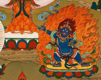 Vajrapani, holding a Diamond Scepter, is the manifestation of all of the buddhas' boundless power and the first meditational deity in this series to be depicted in a wrathful form. He has a third eye of wisdom on his forehead, and the flames of wisdom energy emanate from his mighty body's pores. The name Vajrapani refers to the Vajra wielder, representing the power of total enlightenment.