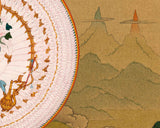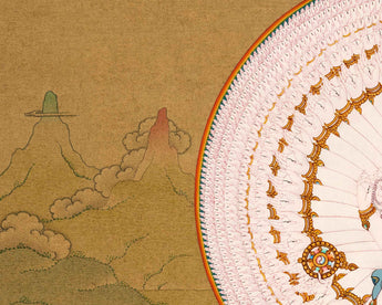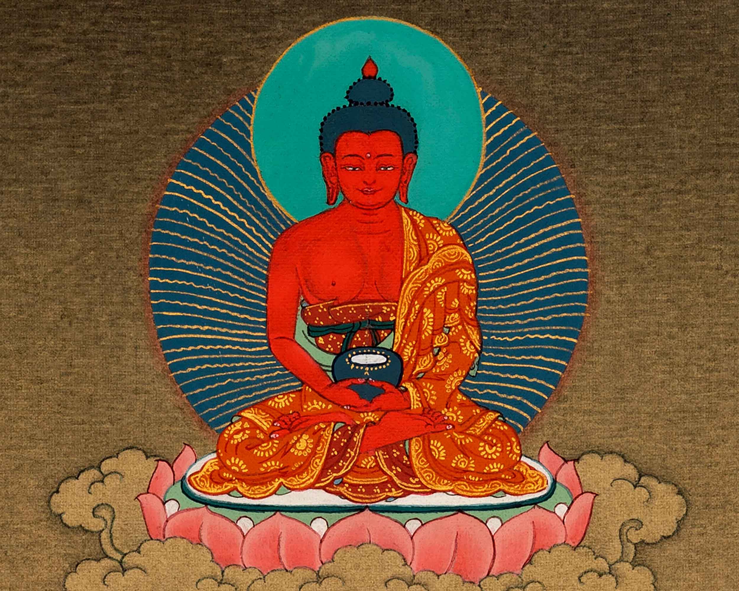 With a sword in his right hand and a lotus stem in his left, Manjushri is reclining on a lotus cushion. On the top, Amitabha is lounging on a moon-disc lotus seat with his knees bent and a begging bowl in each of his hands. The dazzling red halo highlights his calm and placid demeanor. This thangka provides delightful joys in the form of a floating lotus leaf-bearing gift that flows across the white snowy mountains beneath the green hills.