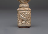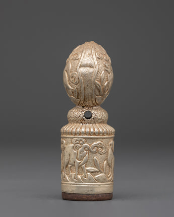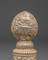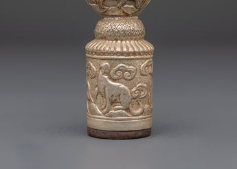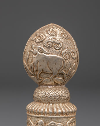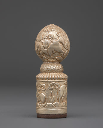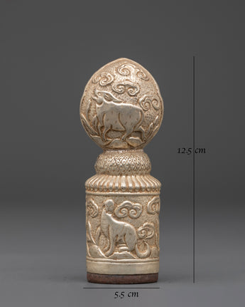This Handmade Spiritual Stamp is a significant ritual tool used in Buddhist ceremonies to bless offerings, prayer materials, and meditation instruments. The cylindrical shape, made of a silver-plated exterior over a copper body, is adorned with symbolic animal images and swirling patterns that represent protection, prosperity, and spiritual energy. Its beautiful carvings make it an ideal addition to any altar, shrine, or meditation space, instilling reverence in spiritual practices.