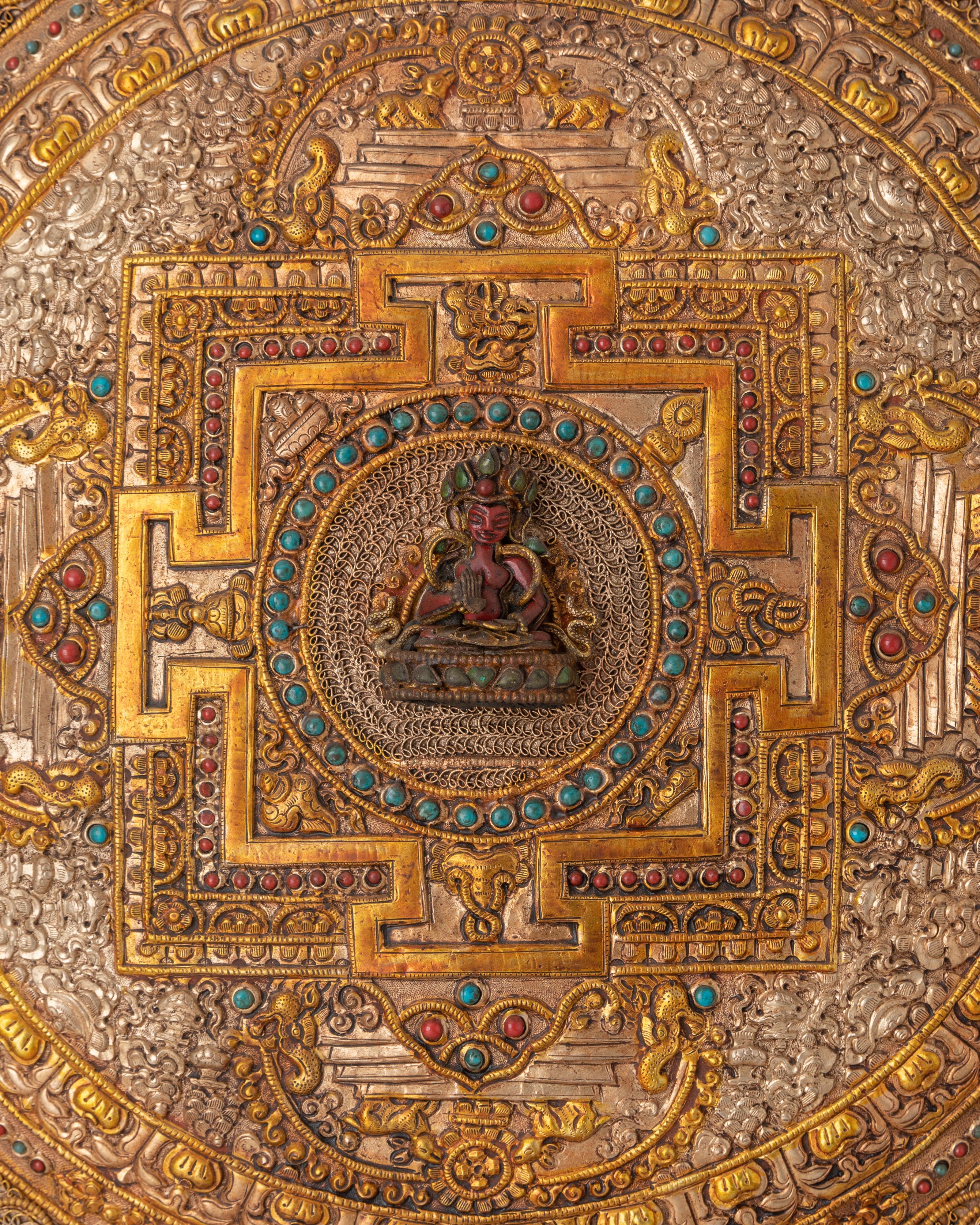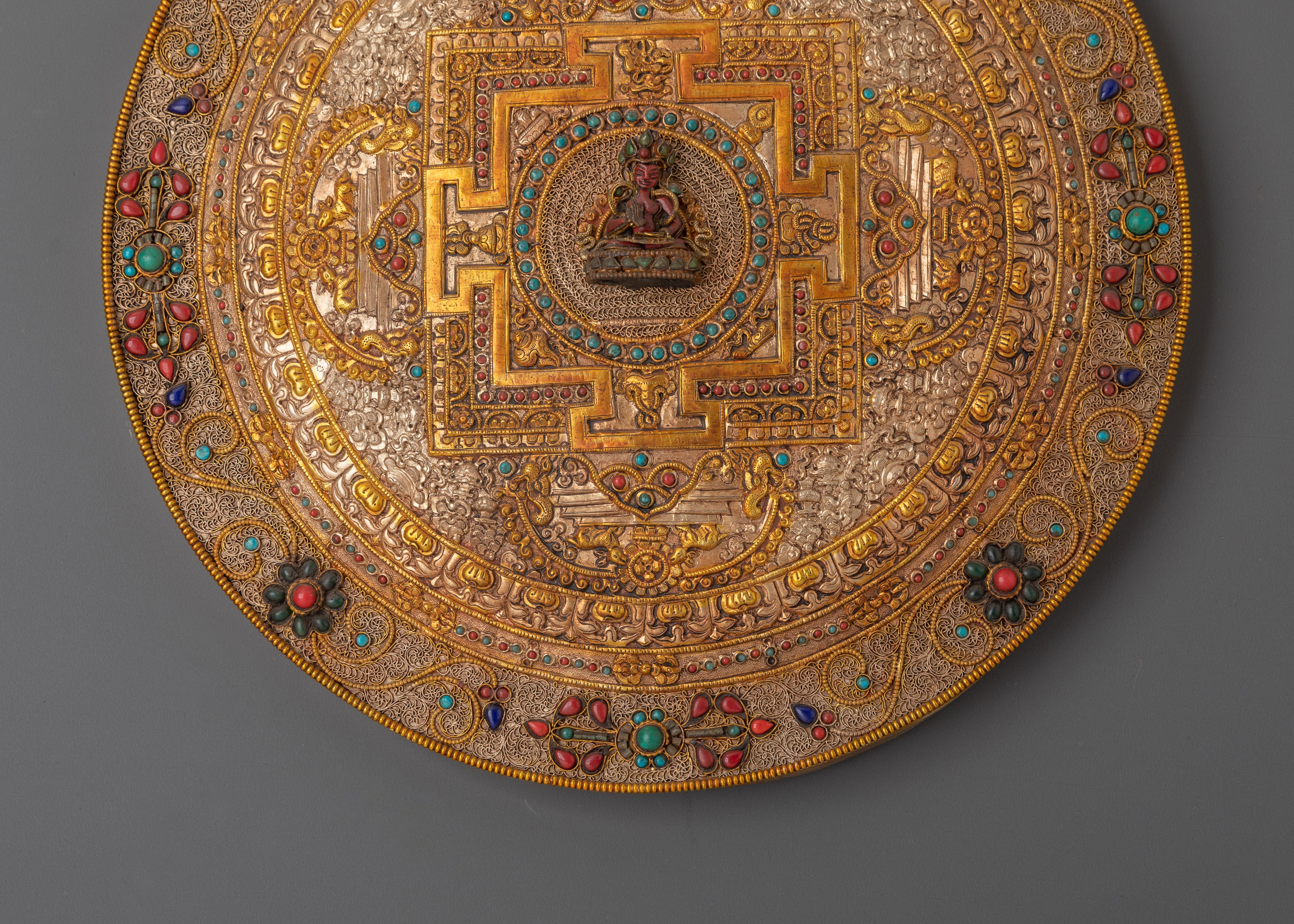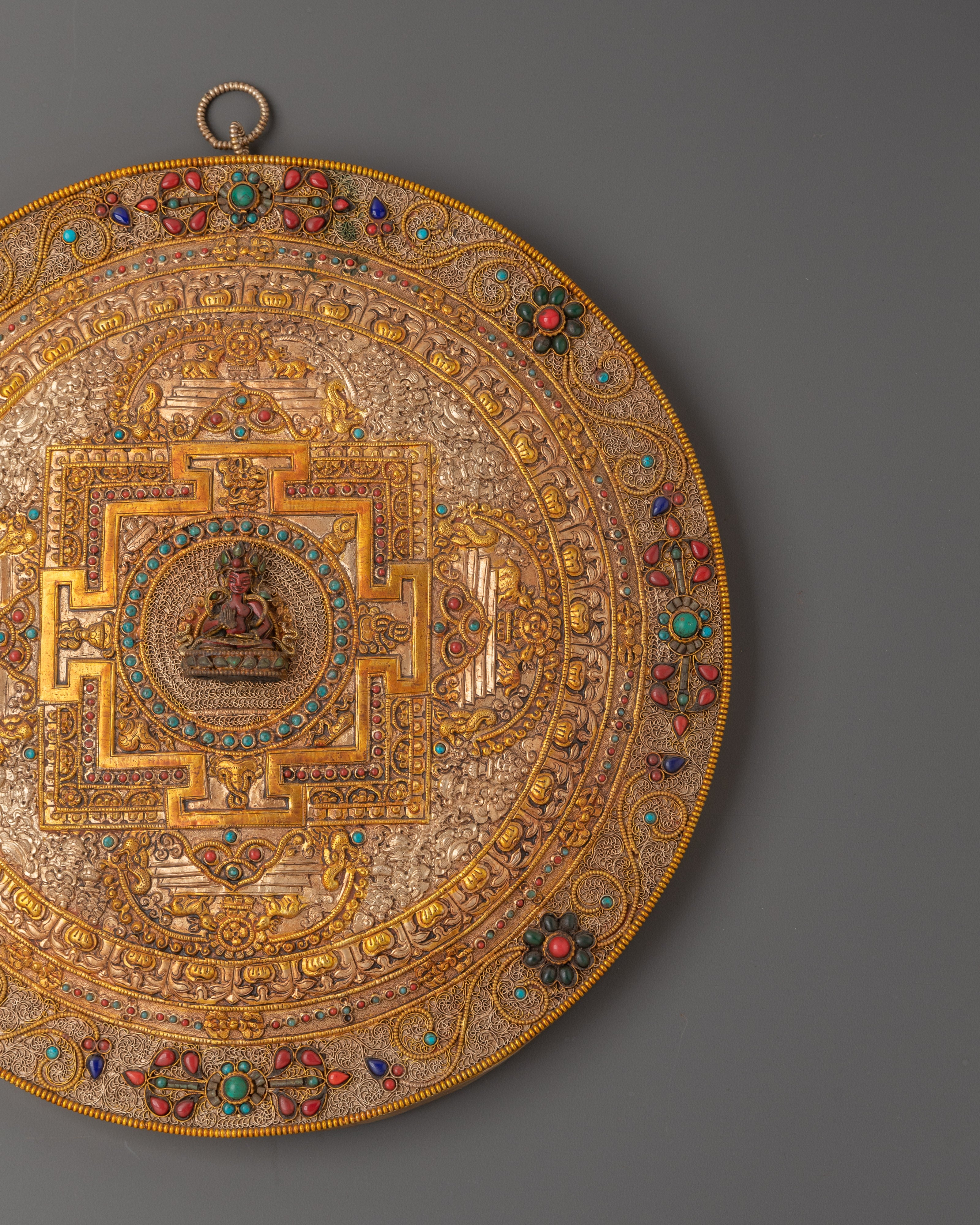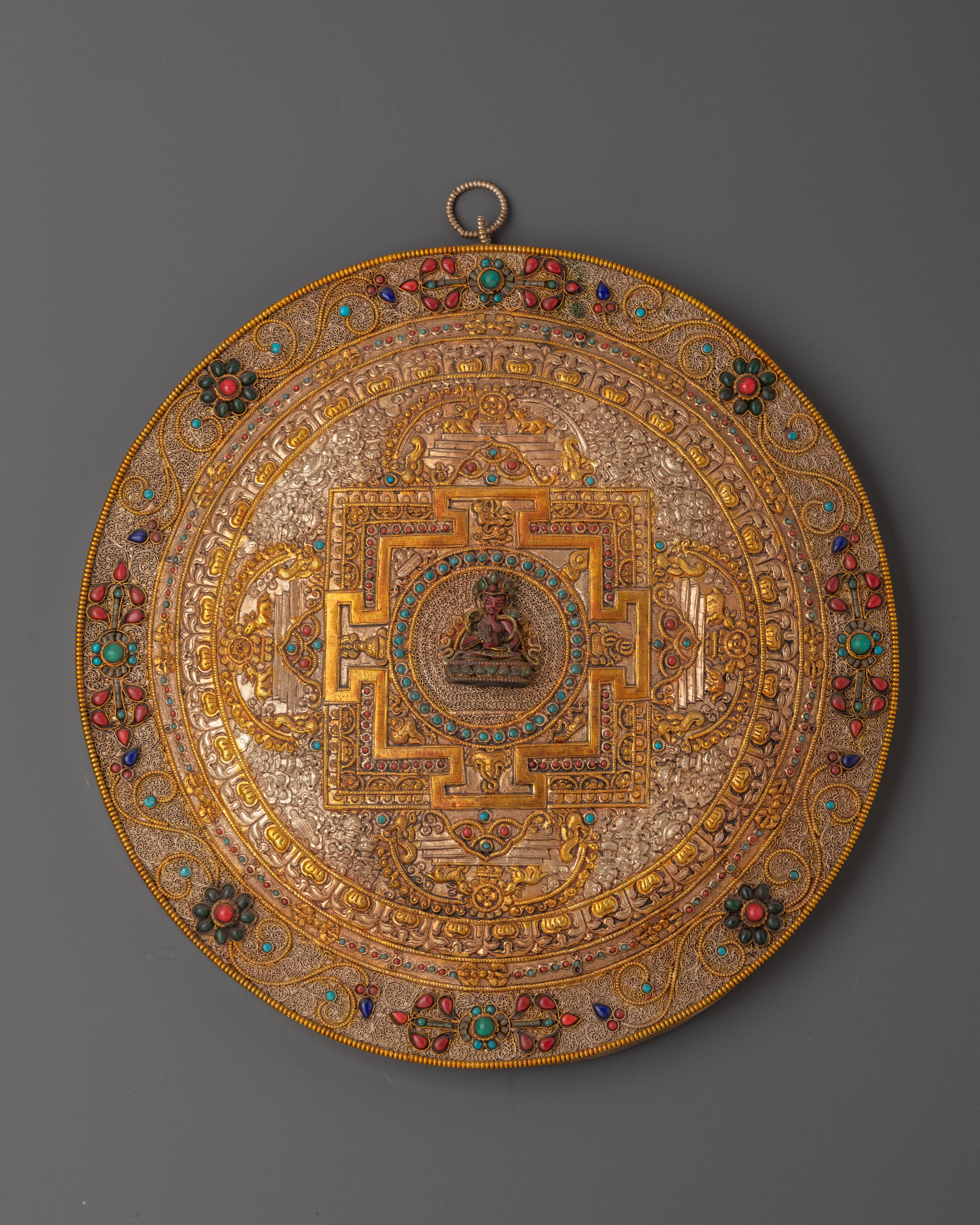 Bring home the elegance of Himalayan workmanship with this Traditional Handcrafted Wall Hanging, which is delicately constructed with holy meaning and spiritual richness. This exquisite sculpture, which measures 38cm in height and 36cm in width and weighs 1.48kg, features the original Mandala design that is commonly utilized in Buddhist meditation and rituals. The centerpiece depicts a seated Buddha image surrounded by layers of decorative geometry, which reflect the cosmos and inner serenity. Each element of the wall hanging is handcrafted from copper and then silver and gold plated for further aesthetic appeal.