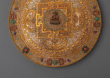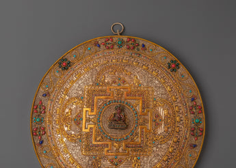 Bring home the elegance of Himalayan workmanship with this Traditional Handcrafted Wall Hanging, which is delicately constructed with holy meaning and spiritual richness. This exquisite sculpture, which measures 38cm in height and 36cm in width and weighs 1.48kg, features the original Mandala design that is commonly utilized in Buddhist meditation and rituals. The centerpiece depicts a seated Buddha image surrounded by layers of decorative geometry, which reflect the cosmos and inner serenity. Each element of the wall hanging is handcrafted from copper and then silver and gold plated for further aesthetic appeal. This beautiful copper Mandala wall hanging is ideal for collectors of holy art, searchers of spiritual harmony, and those looking to add Zen-inspired décor to their homes. It gives tranquility and protection to any place. It's a wonderful masterpiece of traditional Buddhist craftsmanship, built to last and look good.