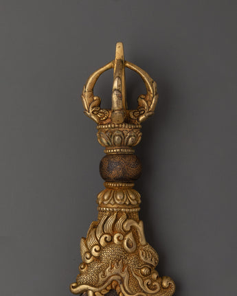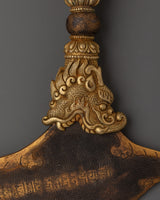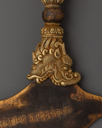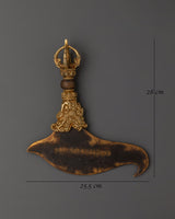 This Traditional Iron Kartika knife, a sacred Tibetan ritual blade used in Vajrayana Buddhist ceremonies, can be utilized to invoke the power of transformation and spiritual discipline. Strength, symbolism, and expert craftsmanship are all combined in this substantial ritual object, which weighs 1.139 kg and measures 28 cm in height by 25.5 cm in width. It has a forged iron blade with a finely sculpted brass handle. The cutting of ignorance, ego, and worldly attachments is symbolized by the kartika, which angry deities have historically employed.
