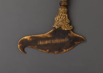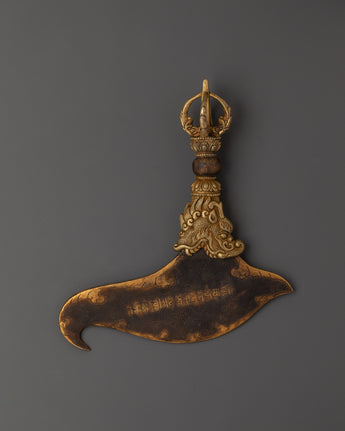The Tibetan Kartika knife is immediately identifiable as a spiritually significant implement due to its distinctive crescent shape. It is utilized in tantric rituals and offering ceremonies to represent cutting barriers on the way to enlightenment, and dakinis and goddesses like Vajrayogini frequently hold it. This Kartika is a striking declaration of inner strength and clarity that can be utilized as a ritual object in puja practice or exhibited on an altar. For Tibetan Buddhists, ritual tool collectors, or those creating a potent spiritual altar, this traditional iron Kartika knife with a brass handle is a must-have item.