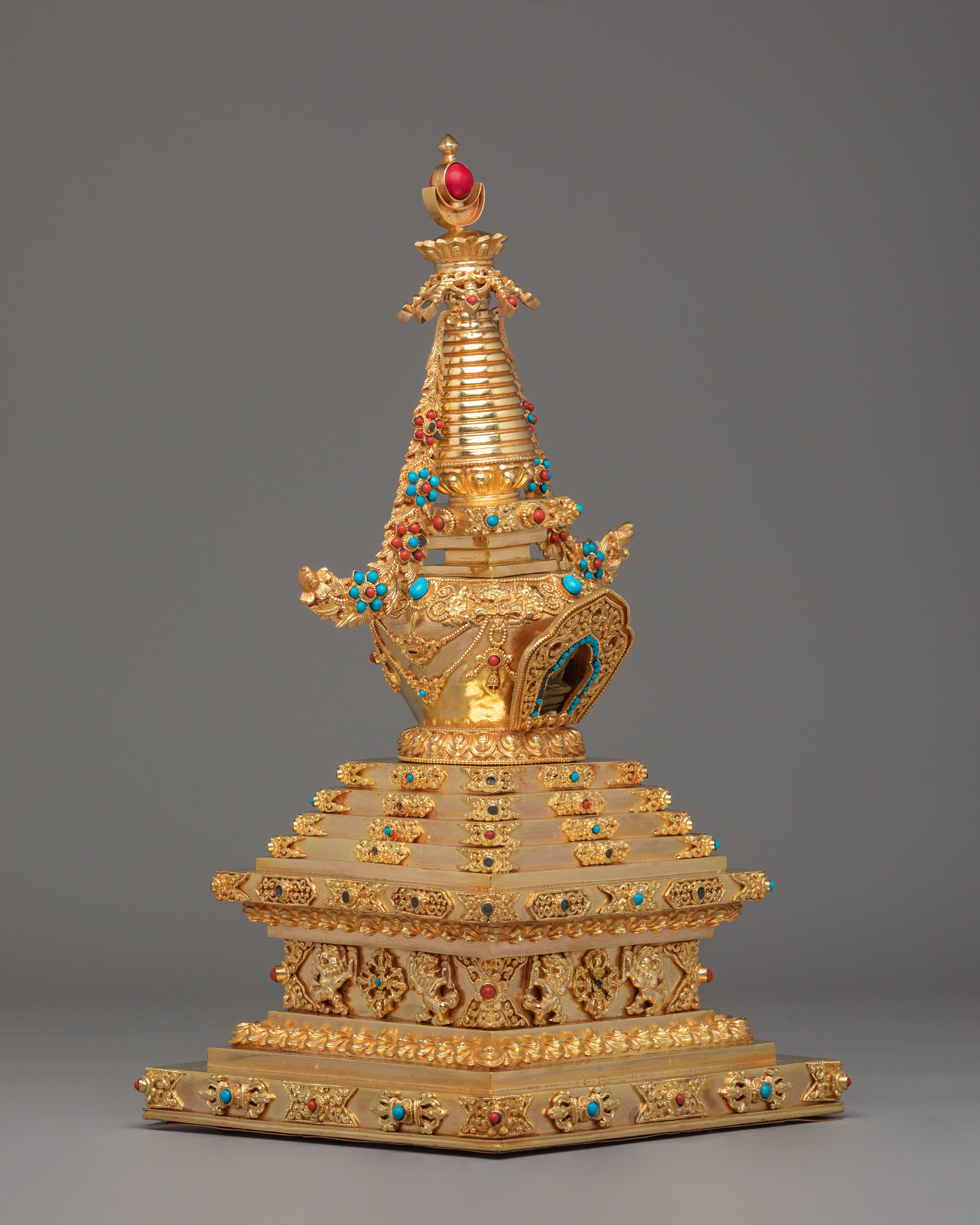 The design of the Jangchub Stupa, also known as the Enlightenment Stupa, follows the classical structure found in Tibetan Buddhist architecture. The square base represents the foundation of spiritual discipline and ethical practice. Above it rises the rounded dome symbolizing the vast nature of awakened wisdom. The spire ascending from the dome represents the stages of spiritual realization leading to enlightenment. Decorative elements and gemstones enhance the sacred appearance of the stupa, while the gold-plated surface highlights the detailed craftsmanship and devotional artistry seen in Himalayan ritual objects. Each section of the stupa reflects symbolic meaning connected to the Buddhist path.