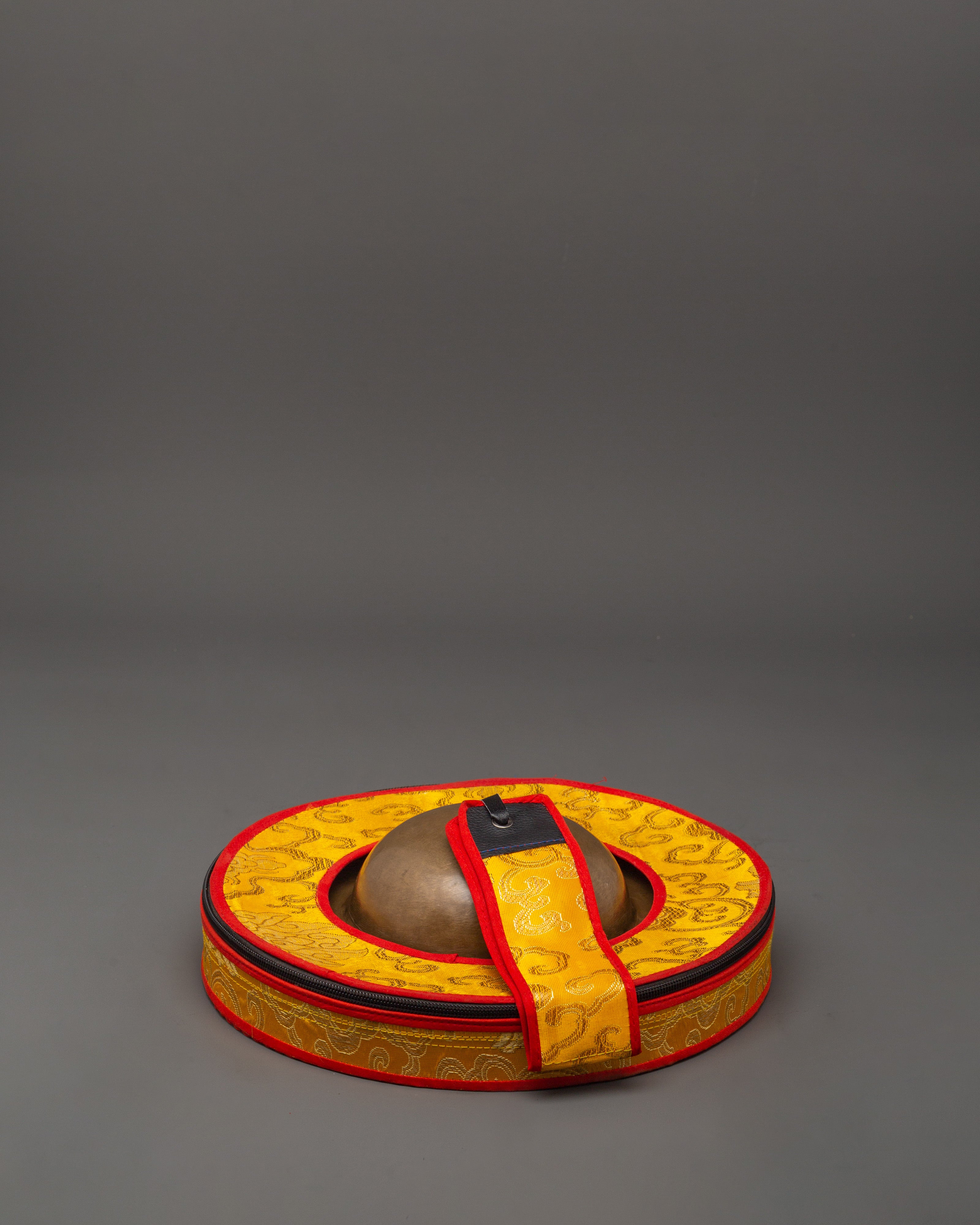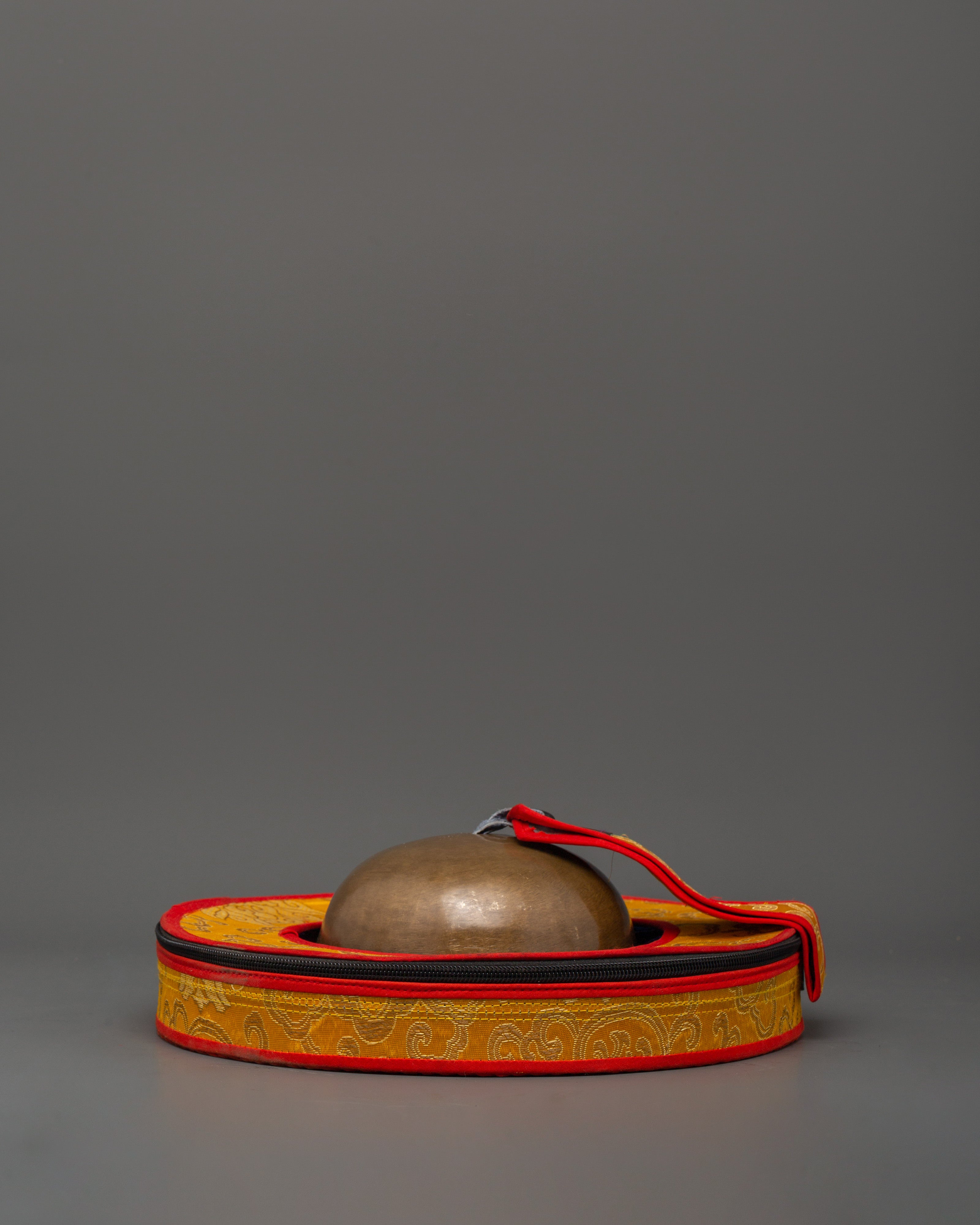 The cymbals are carefully placed in a colorful, fabric-lined travel case with auspicious Tibetan patterns, providing protection and a visually appealing presentation. These handheld Tibetan cymbals are ideal for spiritual practitioners, temple musicians, or sound therapists seeking authentic Himalayan tools based in ancient tradition.
