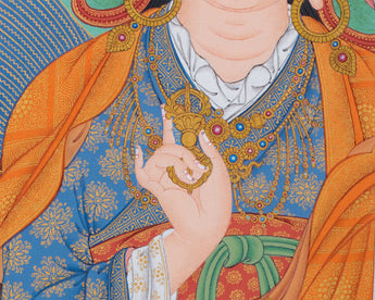 The Traditional Padmasambhava Thangka Print encapsulates the profound spiritual legacy of Guru Rinpoche, also known as Padmasambhava, within Tibetan Buddhism. Crafted with intricate detail and vibrant colors, this sacred artwork depicts Padmasambhava in his iconic form, seated majestically upon a lotus throne amidst a radiant mandala. His serene countenance exudes wisdom and compassion, while his symbolic attributes, such as the vajra and skull cup, represent his mastery over spiritual obstacles and his ability to transmute negativity into wisdom. Displayed in homes, monasteries, or meditation spaces, this Thangka print serves as a potent source of inspiration and guidance for practitioners on the path to enlightenment. Padmasambhava's blessings and teachings continue to resonate through the ages, offering solace, protection, and profound spiritual transformation to all who connect with his divine presence through this sacred artwork.