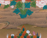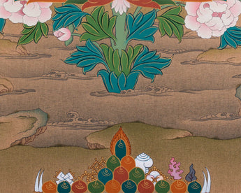 The Traditional Padmasambhava Thangka Print, honoring Guru Rinpoche, The Lotus-Born Master, stands as an iconic symbol of spiritual guidance and enlightenment in Tibetan Buddhism. Padmasambhava, revered as the second Buddha, is depicted in this sacred artwork with serene countenance and boundless wisdom. Adorned in regal attire and seated upon a lotus throne, he radiates an aura of divine grace and transcendent knowledge. Each intricate detail of the Thangka print captures Padmasambhava's profound presence, inviting devotees into a realm of inner peace and spiritual realization. As the Lotus-Born Master, Padmasambhava exemplifies the transformative power of enlightenment and the boundless compassion of the Buddha. Displaying this sacred artwork in homes and meditation spaces serves as a reminder of Padmasambhava's teachings and blessings, guiding practitioners along the path to spiritual liberation and awakening.