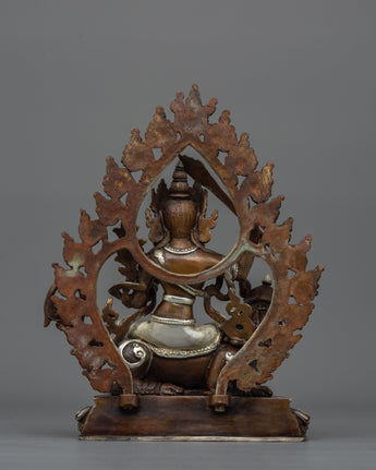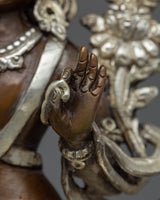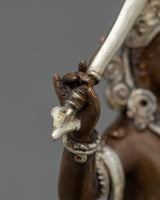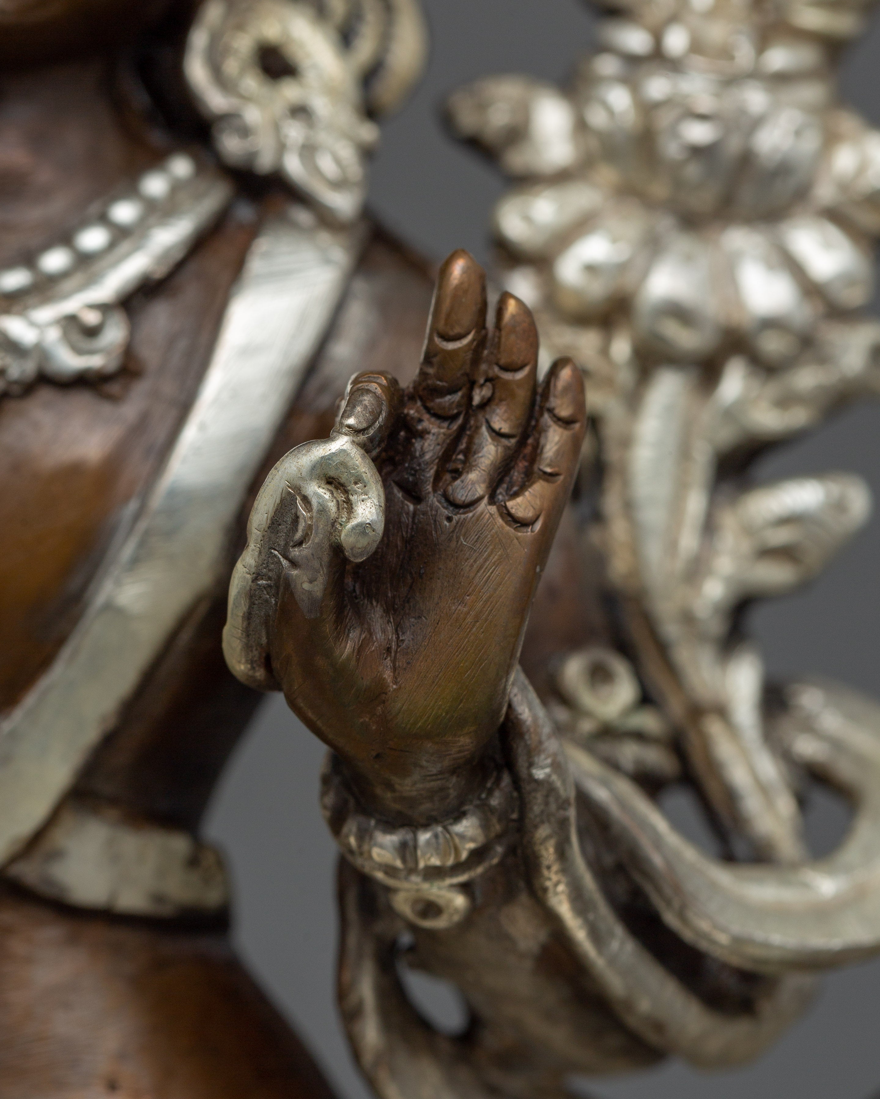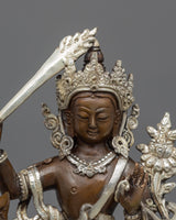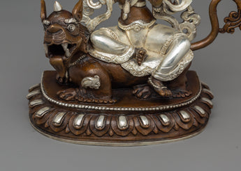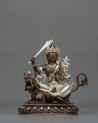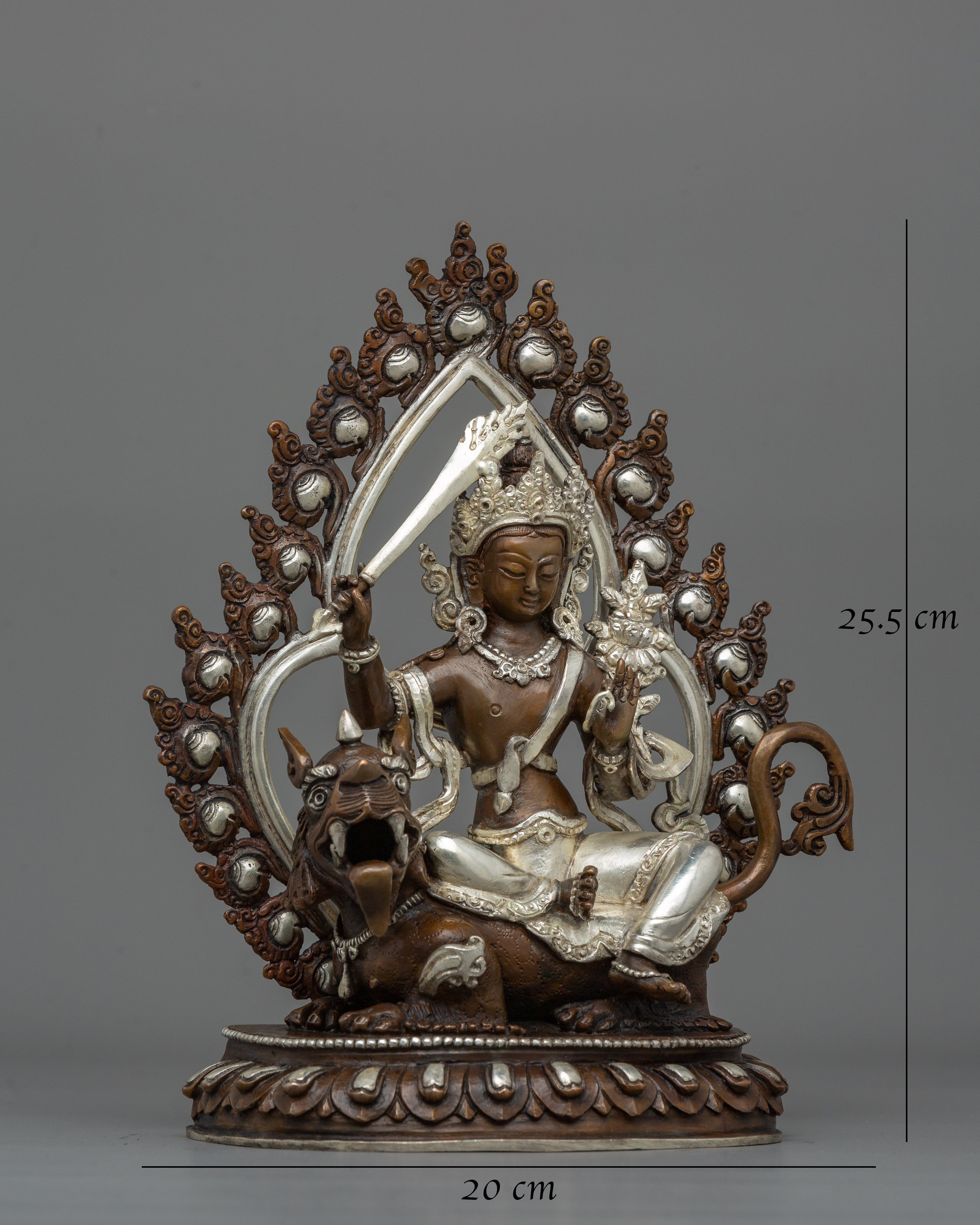 The Sacred Simhanada Manjushri Statue is graciously carved on an oxidized copper body plated with silver, emphasizing craftsmanship and ancient Buddhist artistry. This religious figure weighs 2.36 kg and stands 10 inches (25.5 cm) tall, with a base of 7.9 inches (20 cm).