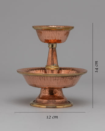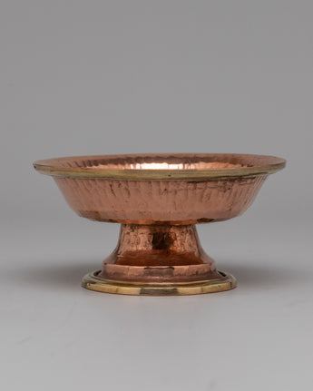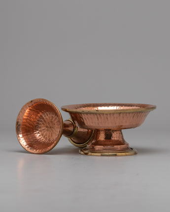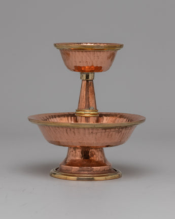 The copper body, which was painstakingly crafted by hand, not only exudes a warm and inviting glow but also denotes purity and reverence. The set is a crucial component of Tibetan Buddhist rituals because it is made to hold offerings like tea, alcohol, or other substances during rituals.