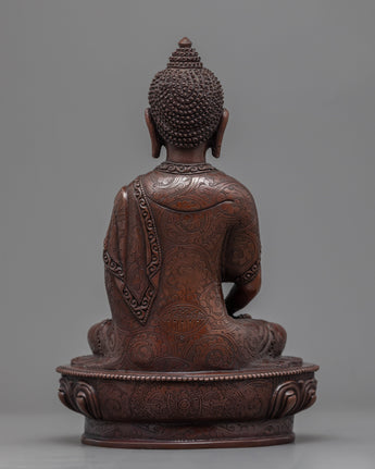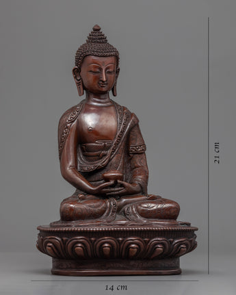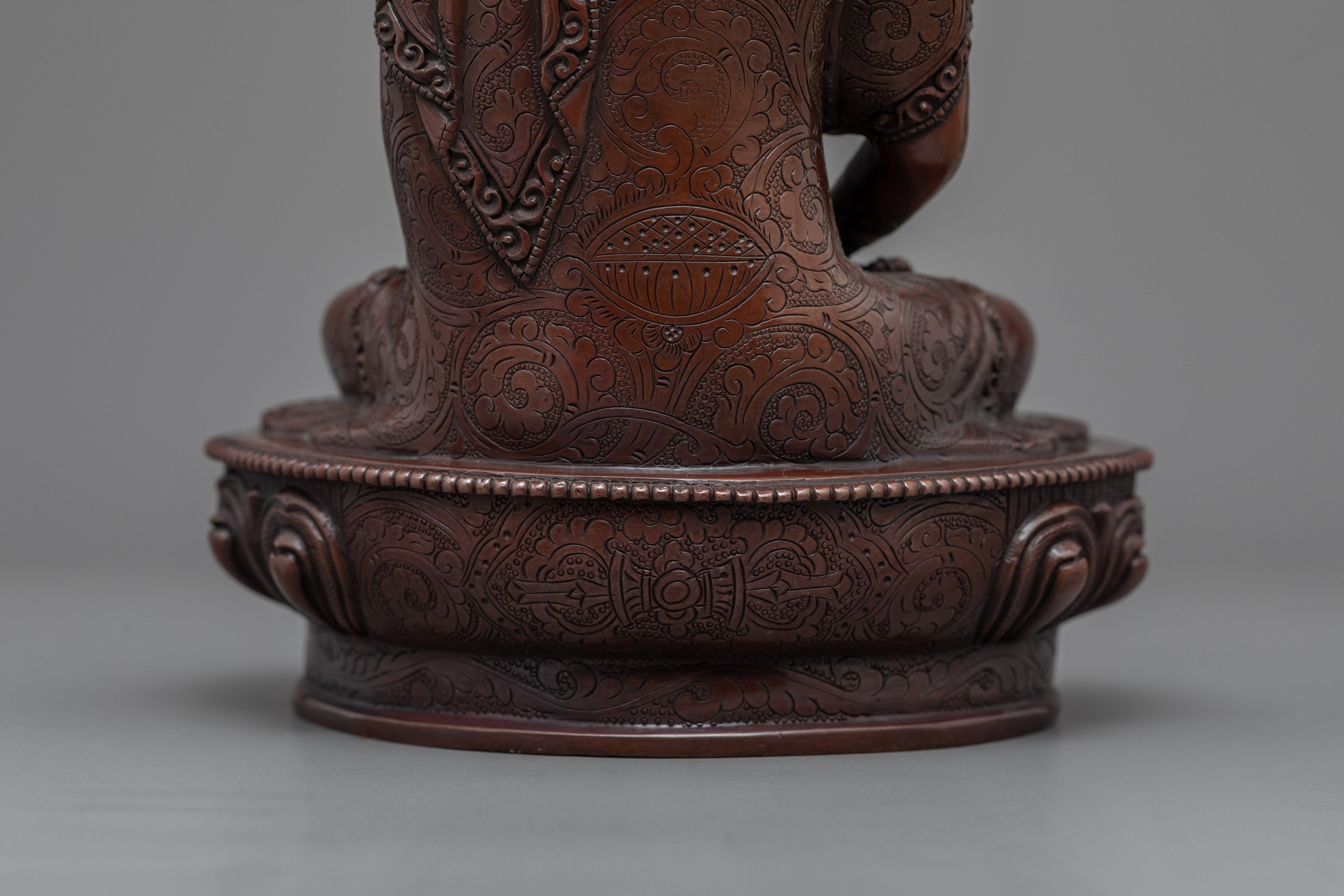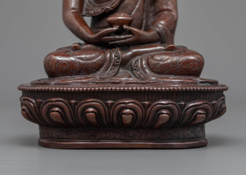 We hand-crafted the Amitabha Buddha Statue in our workshop using oxidized copper with the finest attention to detail. In the statue he is portrayed as having a serene countenance while seated on a lotus seat. His hands are on his lap, and he is carrying a vase filled with nectar of endless life. With the polished finishing of the statue, we sculpted the borders of the robe to provide straightforward yet subtle features. The robe is filled with intricate design patterns.