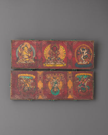 Inside, the aged pages contain ancient scripts and hand-painted figures of deities that offer a glimpse into centuries-old traditions. These sacred texts are treasured by practitioners for guidance and meditation, connecting readers with the rich cultural and spiritual heritage of Tibet. The prayer book’s design blends artistic expression with spiritual purpose, making it a meaningful addition to any collection or altar.