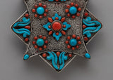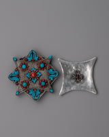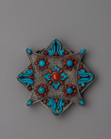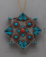 With a weight of 0.104 kg, this Ghau box is the perfect combination of delicate artistry and practical size, making it suitable for both ornamental and functional use. It infuses every environment with a hint of traditional Tibetan elegance and spiritual depth, whether it is utilized as a symbolic centerpiece or to hold priceless objects. This Ghau box is a treasured addition to your collection, expressing the everlasting beauty and cultural depth of Tibetan art. The silver craftsmanship is beautifully contrasted with the vivid turquoise and coral.