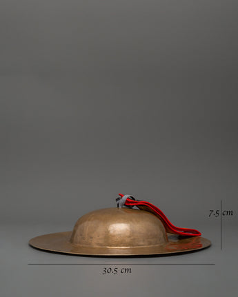 Handcrafted Traditional Tibetan Jhyamta Cymbals, a sacred cymbal utilized in Himalayan Buddhist rituals and ceremonies, provide the reflecting sound of tradition. This pair of cymbals, made of effective Kansa, measures 30.5cm in diameter and 7.5cm in height and produces a deep, strong tone suitable for spiritual offerings, temple music, or peaceful soundscapes. The attached bright strap makes it easier to handle during rituals or presentations.