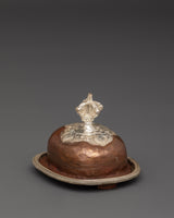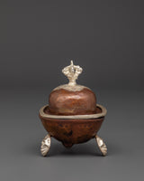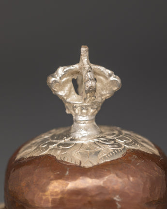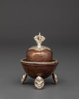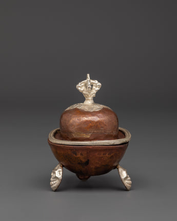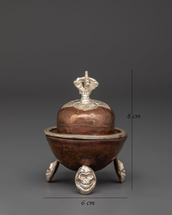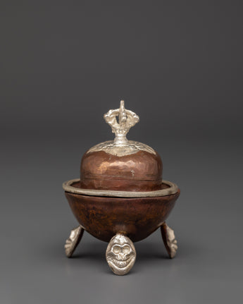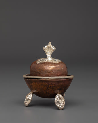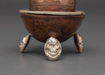 The skull cup, also known as a kapala, is a crucial ceremonial tool in Tibetan Buddhism and tantric rituals. These current copper replicas, fashioned initially from human skulls, represent the impermanence of life and the transmutation of worldly ties into spiritual understanding. The electro-silver coating highlights the vessels' sanctity and beauty, while the oxidized copper adds a timeless, antique vibe. These ceremonial cups are designed to hold offerings such as wine, water, or other liquids that embody enlightened characteristics, making them effective spiritual aids for meditation and ritual practices.