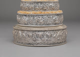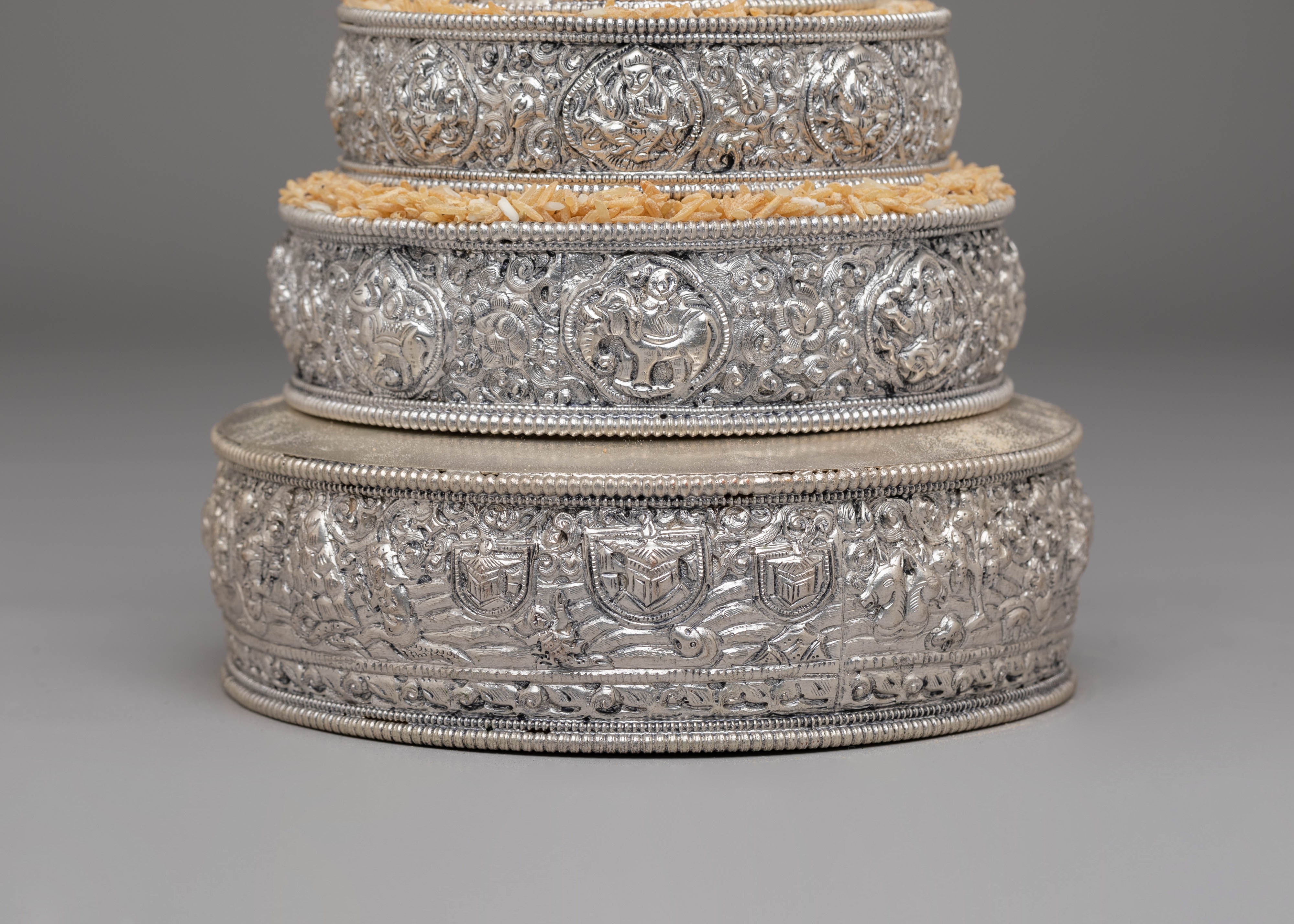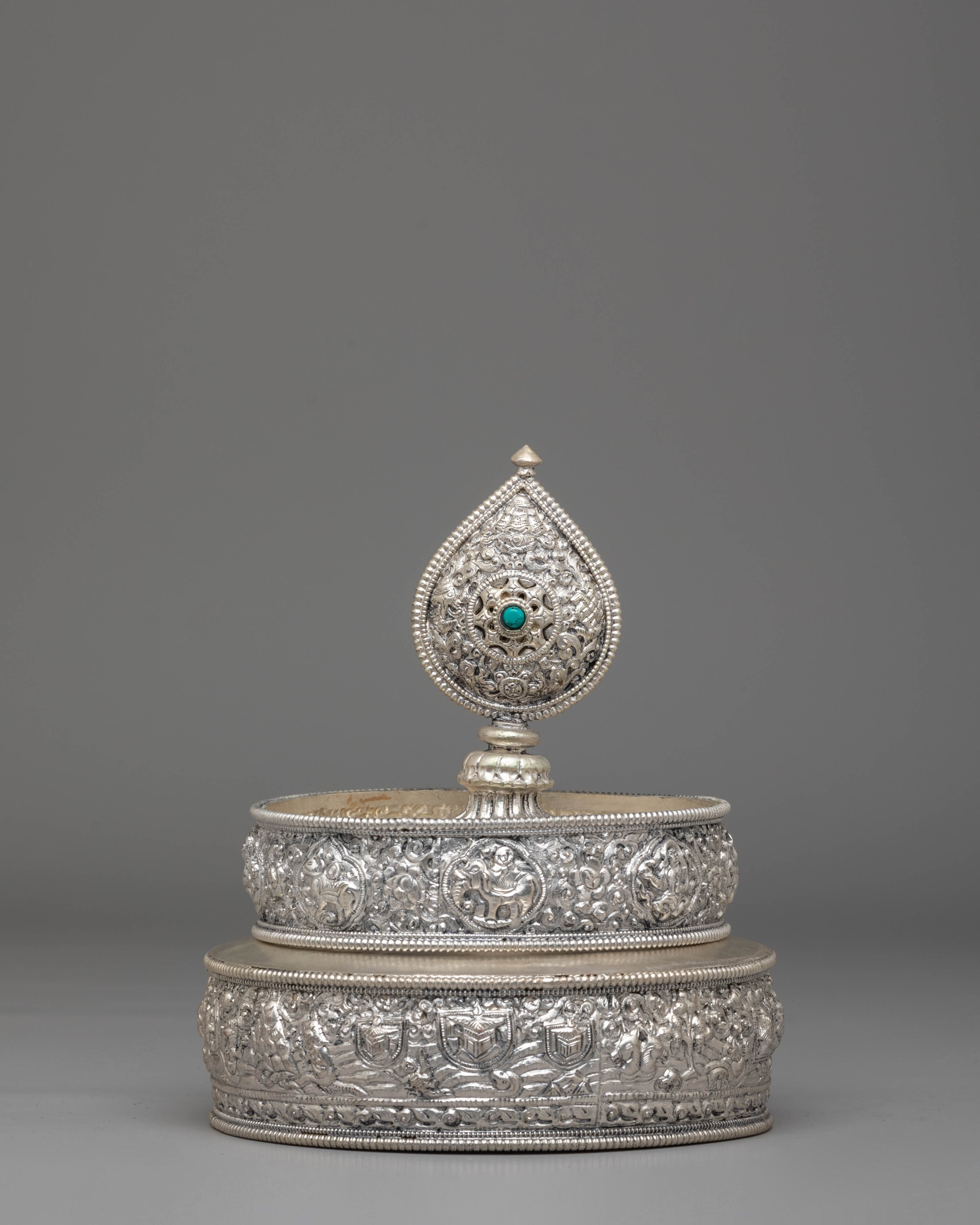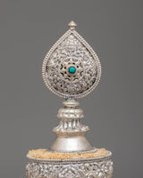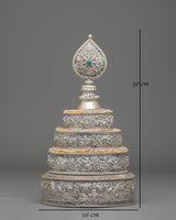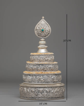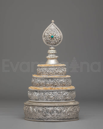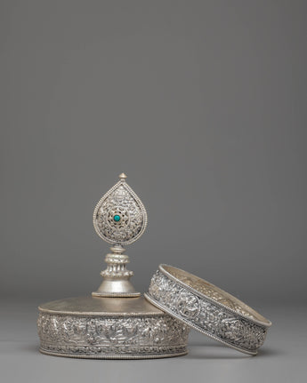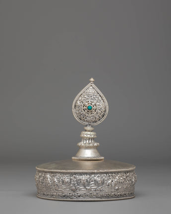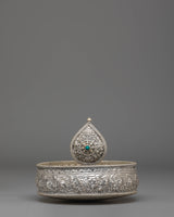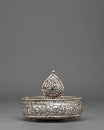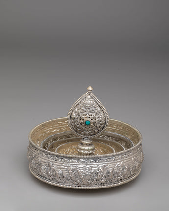 This exquisite traditional Tibetan ritual Mandala is a sacred symbol of spiritual practice and meditation. Crafted from Copper, silver-plated, and adorned with gemstones, it serves as a powerful tool to enhance your spiritual journey. With intricate carvings and symbolic motifs, this mandala helps focus your mind during meditation, fostering deep concentration and inner peace. Its rich design and detailed craftsmanship make it a beautiful addition to any altar or meditation space, inviting divine energy and tranquility into your environment. Elevate your spiritual practice with this stunning piece, which not only enriches your meditation experience but also adds a touch of elegance to your sacred space.