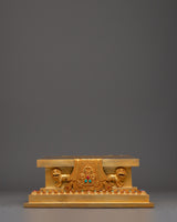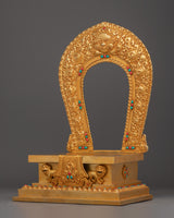 Every detail of this gold-plated copper throne is enhanced with vibrant turquoise and coral stones, which bring color, energy, and protection to your sacred space. Turquoise represents healing and balance, while coral symbolizes compassion and vitality; together, they create harmony within the spiritual environment. The throne’s intricate floral and auspicious motifs are hand-carved with exceptional precision, showcasing the artisan’s dedication to preserving traditional Buddhist aesthetics. Its elevated platform not only enhances the grandeur of the deity placed upon it but also signifies respect for the enlightened state.