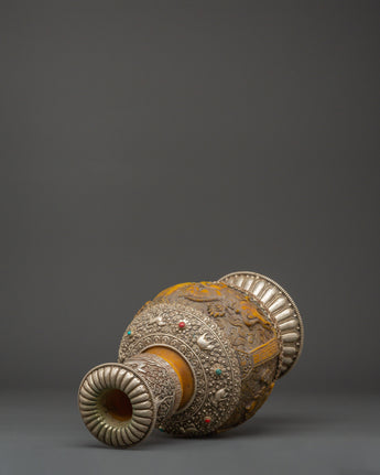 The craftsmanship exemplifies genuine Tibetan creativity, with each element carefully applied to represent harmony and wealth, from the silver plating to the bright stones. The amber tint adds warmth and energy, making it excellent for meditation or embellishing your living space. Enhance your spiritual decor with this Traditional Tibetan Vase, a symbol of Himalayan culture and artistry that adds beauty and great energy to your environment.