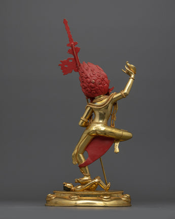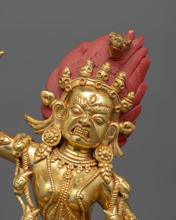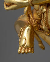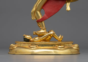 The Traditional Wrathful Vajravarahi Figurine reflects the dynamic energy and transforming power of this famous Vajrayana Buddhist deity. This statue is hand-crafted with 24K gold gilded copper, enhanced with acrylic paints, standing at 16.1"/41cm in height with a base width of 8.5"/21.5cm and weighs 3.24 kg. Vajravarahi, also known as the Diamond Sow, symbolizes the intense compassion and knowledge required to transcend ignorance and delusion. Her wrathful yet compassionate aura reflects her role as guardian and guide to spiritual awakening.